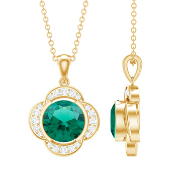 Created Emerald halo necklace design is all about a lab emerald gemstone in the center protected by small shining gemstones for added sparkle or colored gemstones for a more vibrant look. These stylish neck pieces can add a touch of glamour to any look.