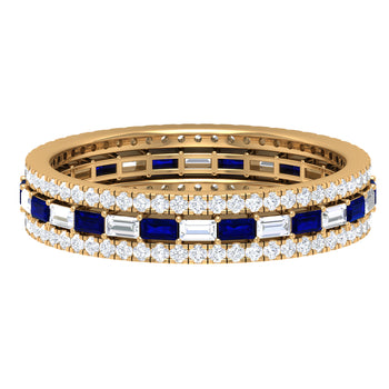 Typically, it is a type of metal ring that features gemstones set in a continuous band around the circumference of the ring. If you’re seeking something simple to flaunt regularly, a band with subtle colored stones such as Morganite, Aquamarine, Moissanite, or a Classic 14K White Gold Gemstone Band could be the one. While if you’re a little more fond of a pop of color, deeply hued stones such as Ruby, Blue Sapphire, Emerald etc., or a Yellow or Rose Gold Gemstone Band might do the job right.