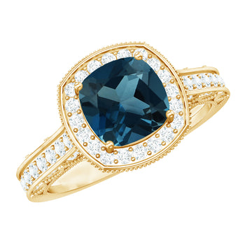 Sold out - 8 mm Cushion Cut London Blue Topaz Halo Engagement Ring with Diamond+sp.priceRaw ? 'price price--on-sale' : 'price'">