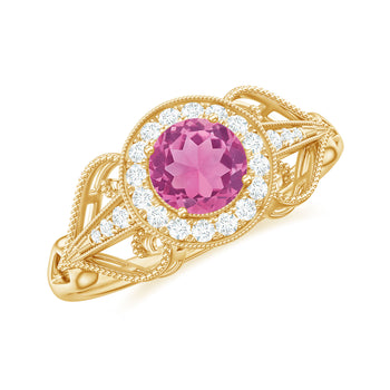 Easily the go-to ring style for the classic bride-to-be, this Solitaire Ring is defined by a Centerpiece of Pink Tourmaline that stands all alone (preferably mounted in a Simple Setting). The feminine appeal of Pink Tourmaline here is meant to catch the most attention owing to its enormous size of 6 MM or more. While the minimalist and timeless aesthetic of this engagement ring sets it apart, its versatility (thanks to the many shapes it is fashioned with) deserves just as many praises. While a Round Pink Tourmaline Engagement Ring speaks to conventional couples, the one fashioned with Pear, Marquise, or Pear Cut is more on the fancier side of the spectrum. If you’re the kind of bride-to-be who fancies a grand and slightly Vintage Pink Tourmaline Engagement Ring, go for the one handcrafted with Asscher, Cushion, or Emerald Cut.