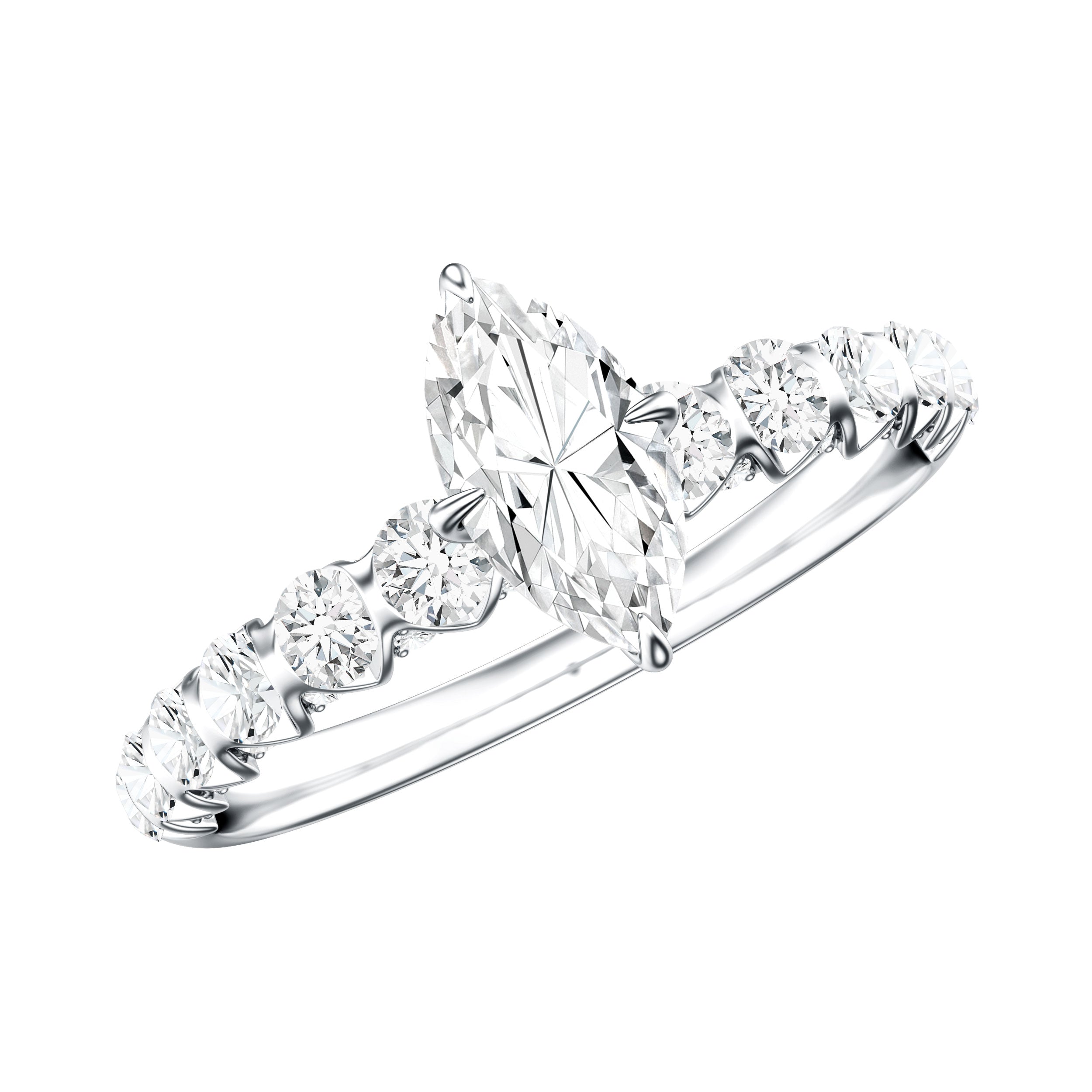 Hailed as a standout for its unique and fancy aesthetic, a Marquise Moissanite Engagement Ring features pointy ends and curved sides (making it look close to a football). Featuring 58 facets, it appeals with its unique bow-tie effect (that you’ll notice at the center of the Moissanite).