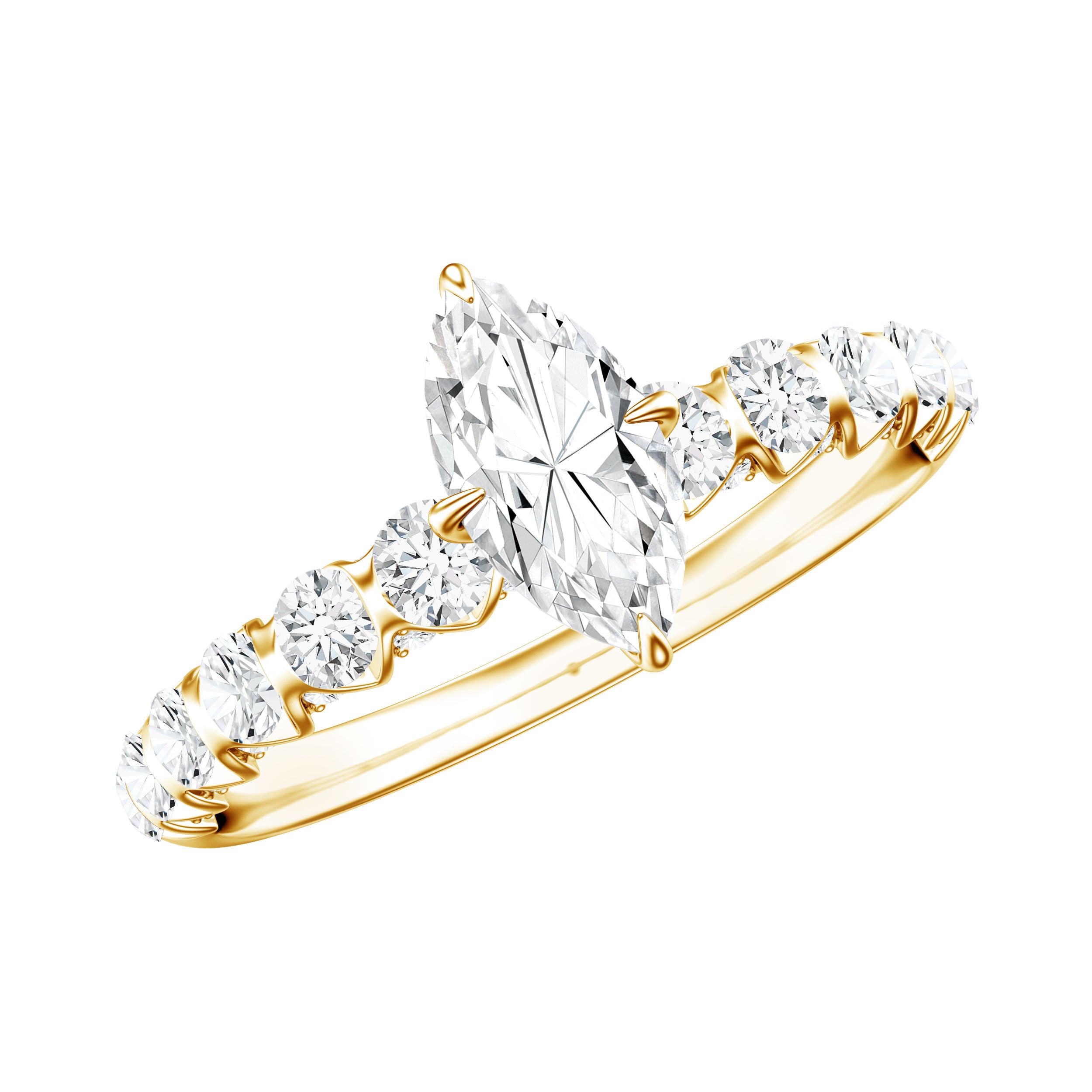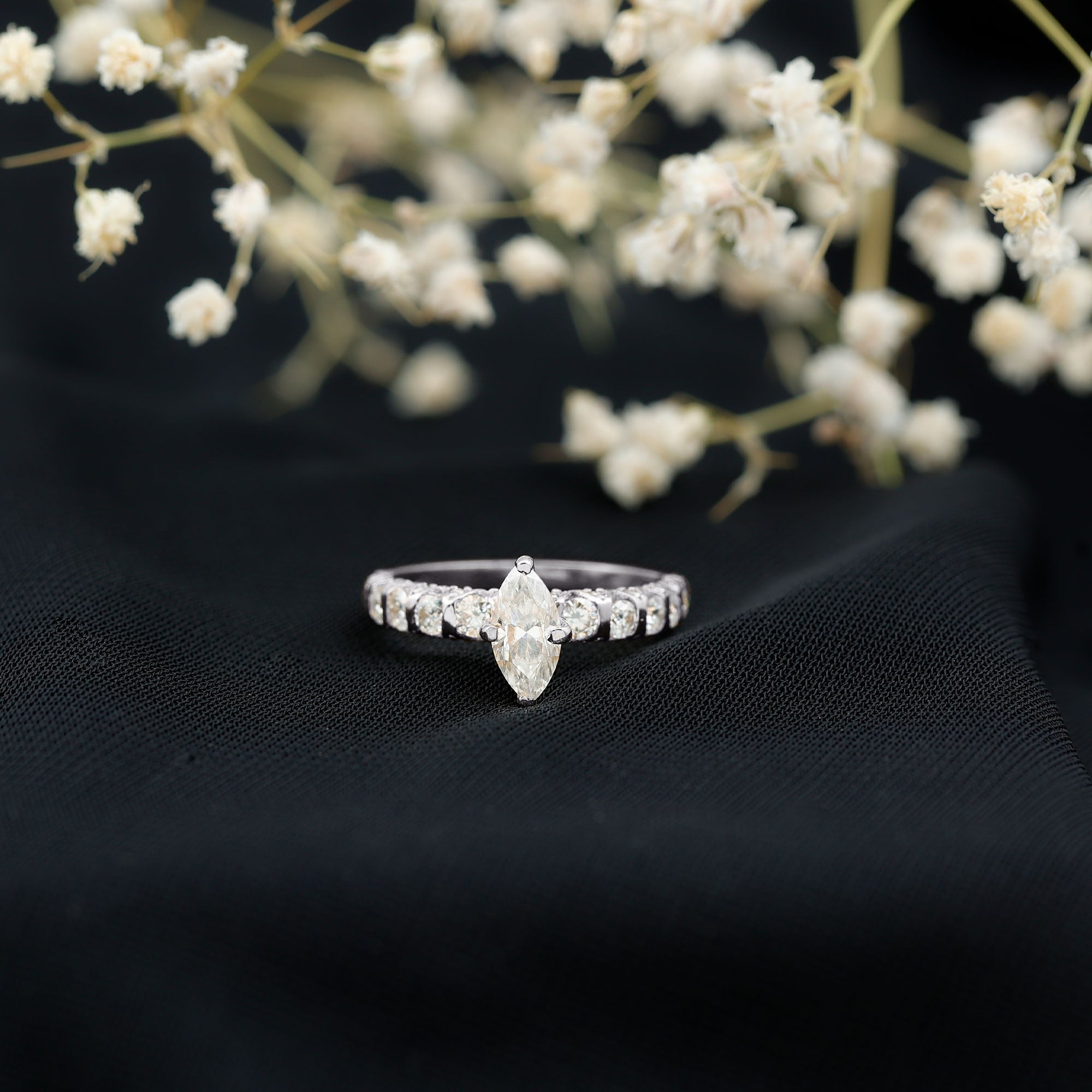 A Moissanite Solitaire Engagement Ring is defined by a Sparkling Centerpiece of Moissanite that is meant to stand out all solo (with an enormous size of 6 MM or more). While it may be the most classic and timeless token of love for any bride-to-be, it also speaks to many senses of style. A Round or Oval Moissanite Engagement Ring resonates with an understated and conventional aesthetic, while one fashioned with a Pear, Marquise, or Princess Cut Moissanite is more on the fancier side of the spectrum. On the other hand, if you wish for a grand yet old-school emblem of love, there is nothing better than an Asscher, Emerald, or Cushion Cut Moissanite.