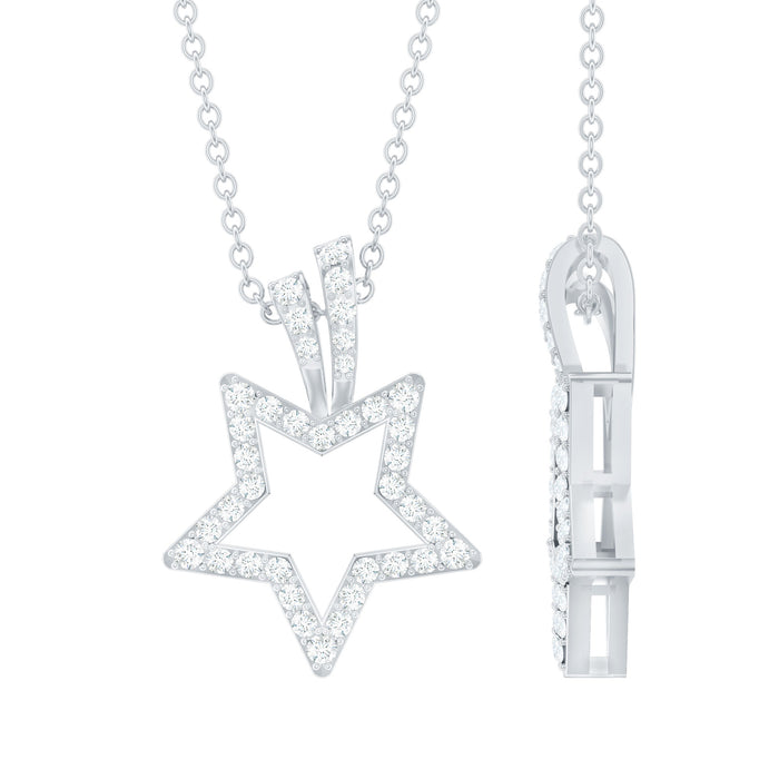 This exquisite moissanite pendant necklace is guaranteed to steal her heart. Featuring a beautifully crafted star pendant made of high-quality gold, it is embellished with a round cut moissanite stone in a prong setting. The sparkling moissanite stone adds a touch of glamour and sophistication to the piece, making it a perfect accessory for any occasion. With its timeless design and exceptional craftsmanship, this pendant necklace will remain a cherished piece of jewelry that shell treasure for years to come.