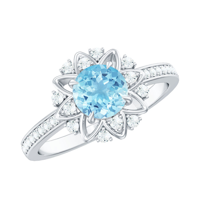 Claw Set Round Aquamarine Ring is accentuated with Gold Floral Pattern and Round Diamond in between and also as Side Stones. This Aquamarine and Diamond Engagement Ring is full of beauty and charm. Elate your pretty lady with this Aquamarine Engagement Ring on her special day.