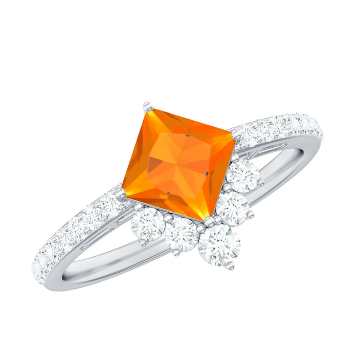 Radiating Princess Cut Fire Opal Engagement Ring is embellished with designer pattern created by Round Diamond. This Fire Opal Ring will absolutely make you dazzle with its fine charm. The Half Halo created by Diamond make this ring a creative look. Splendidly crafted in Gold, this Engagement Ring is stunning choice for your special day.