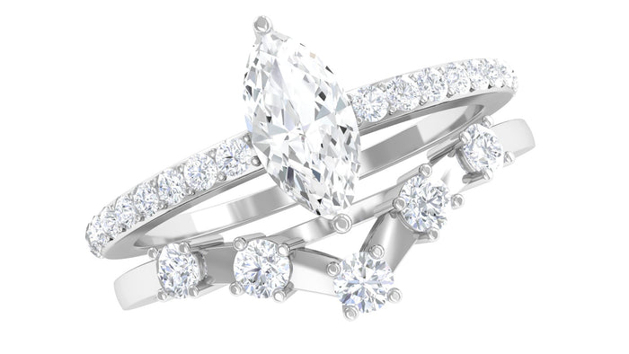 Marquise Cut Zircon is glistening in the center of this zircon encrusted band and another band of this ring set is embellished with round zircon, held in prong setting in a chevron band. This Zircon Bridal Ring Set is crafted in Gold for luxurious appeal.