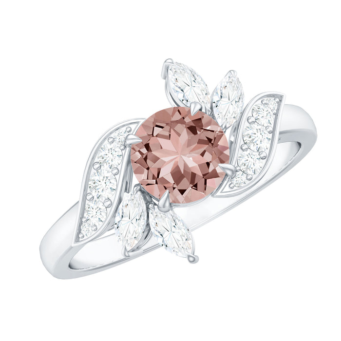 Every moment of yours is worth celebrating, so why not celebrate it with an alluring fine jewelry. This Morganite Engagement Ring is exactly what your are looking for your partner, Round Morganite and Marquise Diamond is held in Claw Setting and Round Diamond is held in prong setting are featured in leaf pattern. Show your love to your partner with this Vintage Morganite Ring.