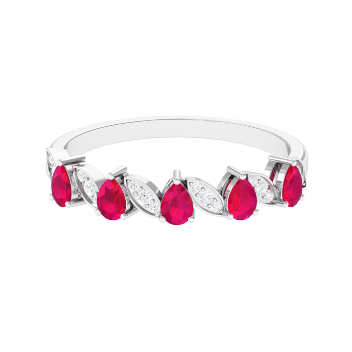 Defining your love for your lady love has never been easier with this Ruby Half Eternity Band Ring. Featuring a Pear Shape Ruby in a prong setting, this Semi Eternity Ring is both elegant and functional. Additionally, it features a Round Diamond set in a Prong setting on a Marquise Gold Metal. Your lovely spouse will be delighted to receive the beautiful July Birthstone Ring.