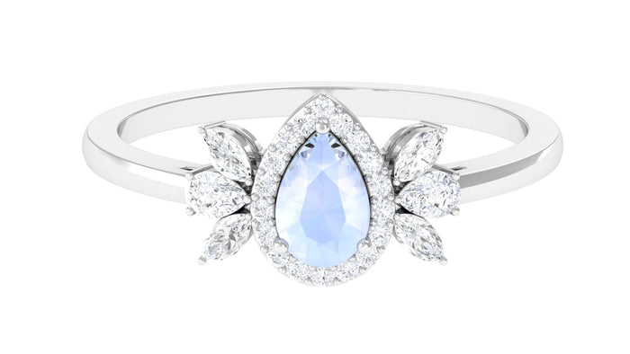 This beautiful engagement ring features a stunning pear shaped Moonstone center stone that is sure to captivate the eye. The Moonstone is complemented by sparkling round Diamond halo and pear and marquise shape Diamond trio on either side, adding extra brilliance and fire to the design. This elegant and feminine design is perfect for those seeking a unique and romantic piece of jewelry.