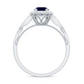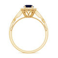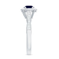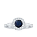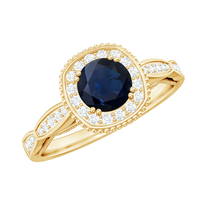 The littering Halo Engagement Ring features delicate Surface Prong Set Diamond Halo that encircle the center Round Shape Blue Sapphire with a designer shank, and adorn the band with Milgrain Detail. The Antique Design makes this ring light and feminine for a truly special look. Adorn yourself with our perfect Blue Sapphire Engagement Ring on your big day.