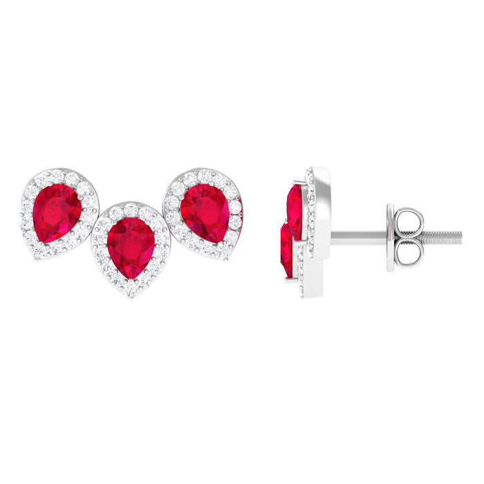 Modern and unique these 3 Stone Earrings embellished with Pear Cut Created Ruby accentuated by Diamond Halo will set you apart from the crowd.