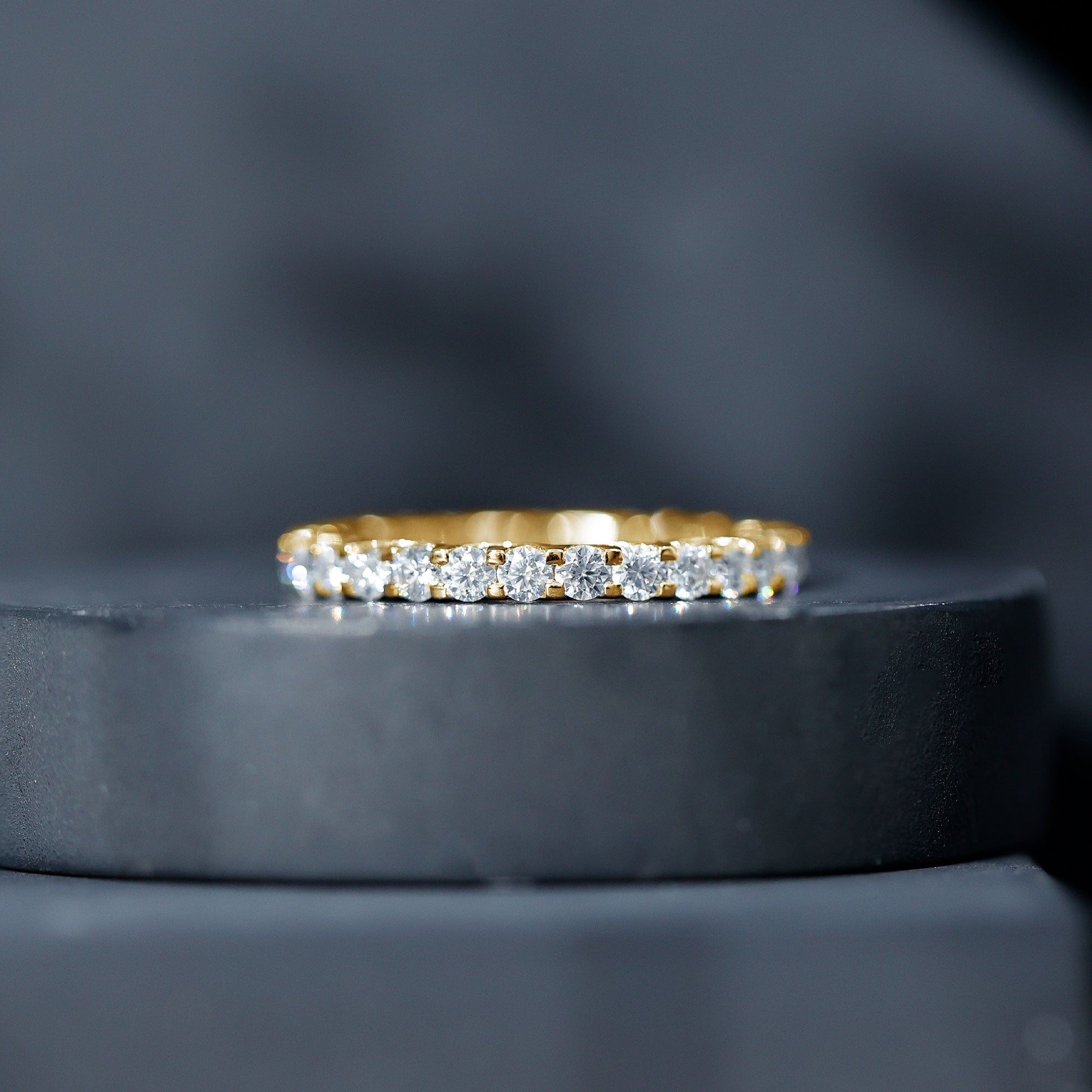Half eternity rings feature stones on the upper half, covering 1/2 or 3/4 of the band. Considered more practical and comfortable, they allow larger stones compared to full eternity rings.