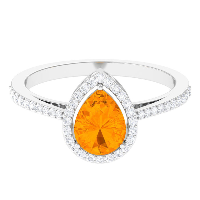 A stunning and timeless Teardrop Engagement Ring with a beautiful design would make a wonderful gift for your significant other. This understated yet elegant engagement ring features a Pear Cut Fire Opal at the center, surrounded by a Halo of Round Diamond stones and Side Stones. The Fire Opal Engagement Ring is crafted with Gold Metal for a luxurious finish.