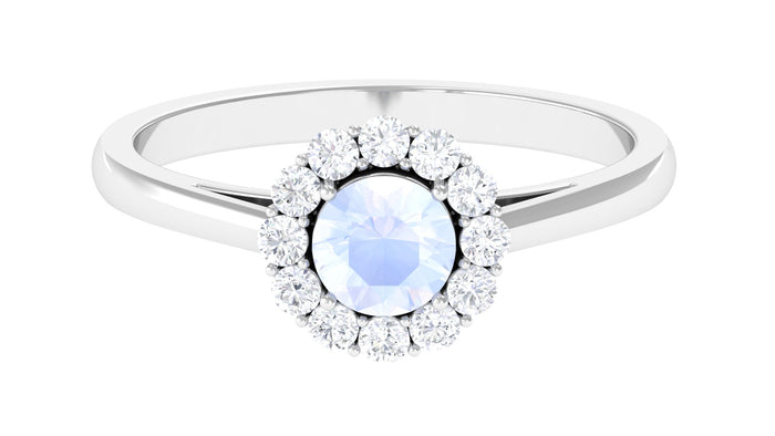 Enhance your beauty with Floating Halo Engagement Ring is embellished with Round Shape Moonstone Set as a solitaire in a prong setting and Round Shape Diamond in a floating Halo. This Engagement Ring is composed of solid gold.