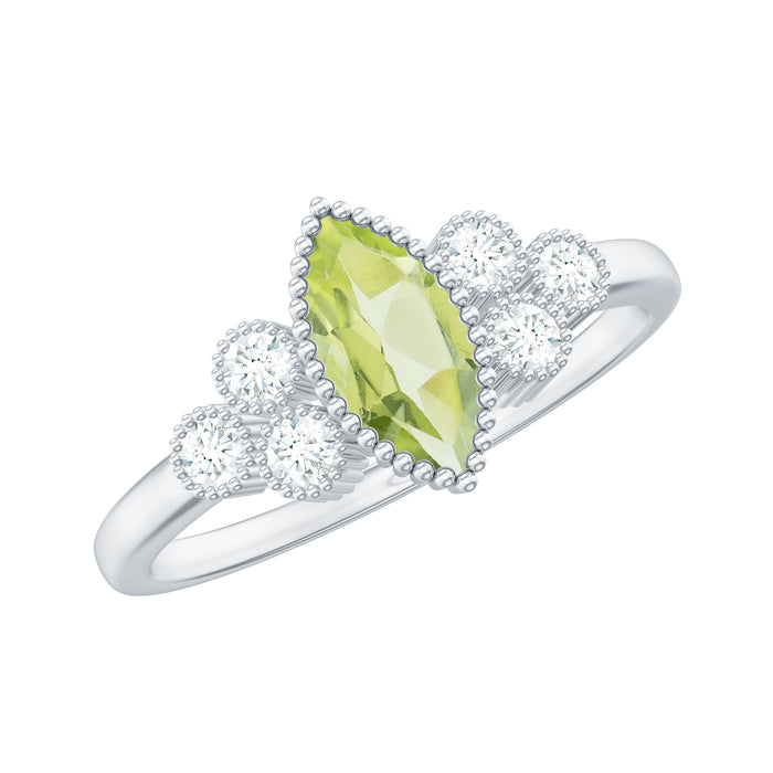 Bring out your alluring look by wearing this elegant Peridot Solitaire Ring embellished with Marquise Cut Peridot in a Designer Setting with Round Shape Diamond Trio. Crafted with Gold, this Peridot and Diamond Ring will give you a luxurious look. This Peridot Ring will be a perfect birthday present for your lady love.