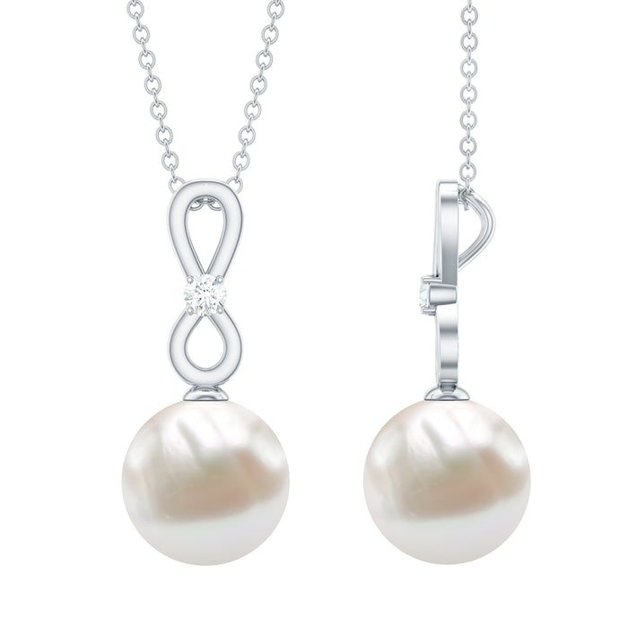 The Solitaire Pendant is fitted with 10 MM Round Shape Freshwater Pearl in Bead Setting with Round Diamond uniquely arranged in Prong Setting on Solid Gold crafted Infinity Symbol. The Infinity Pendant Necklace is a perfect piece for your lovely spouse.