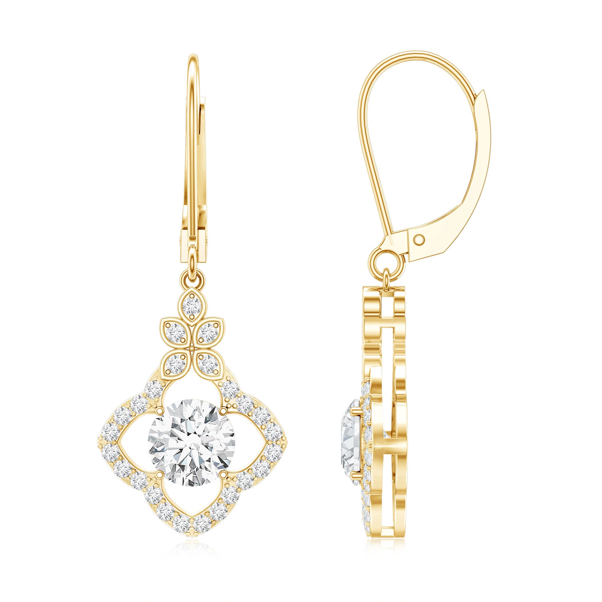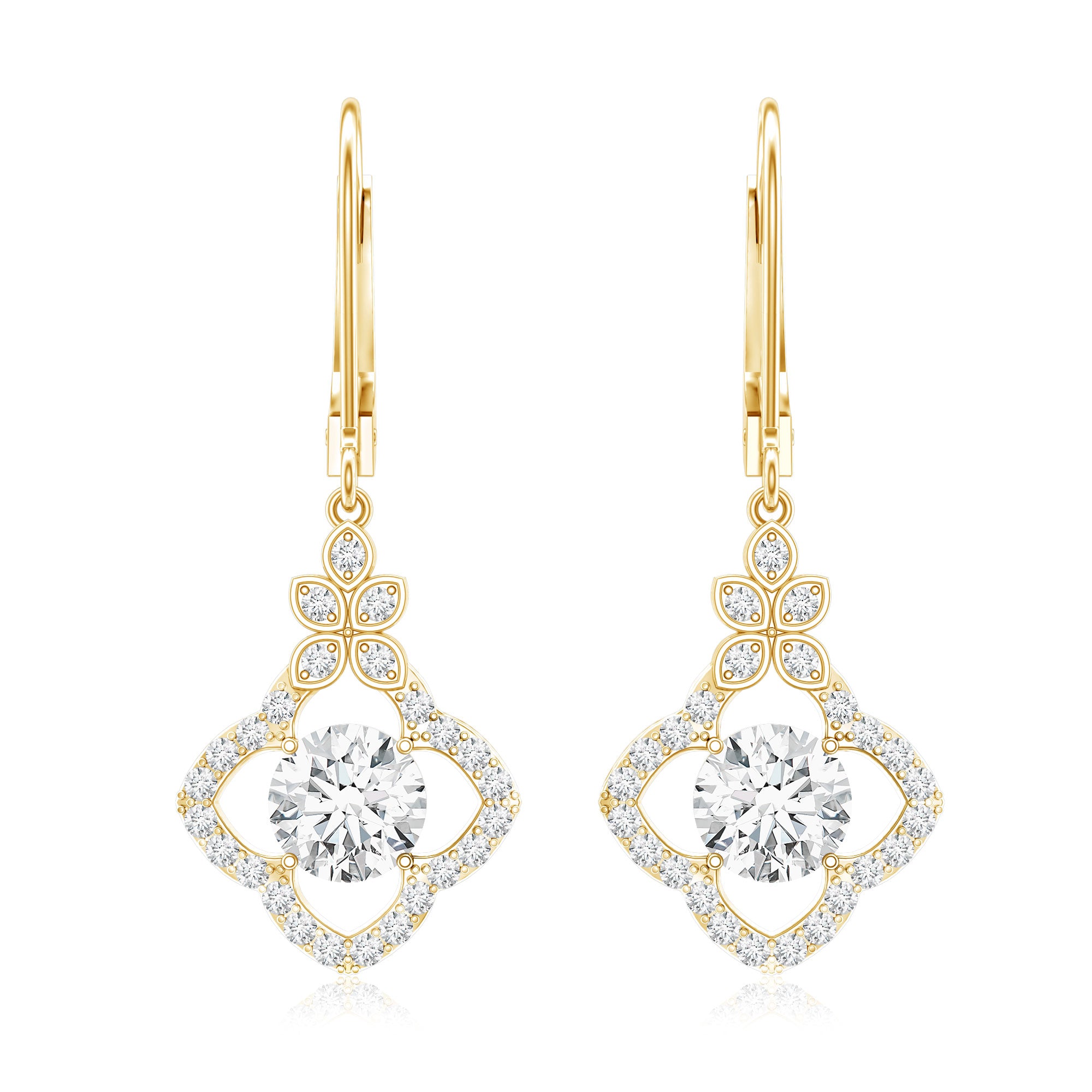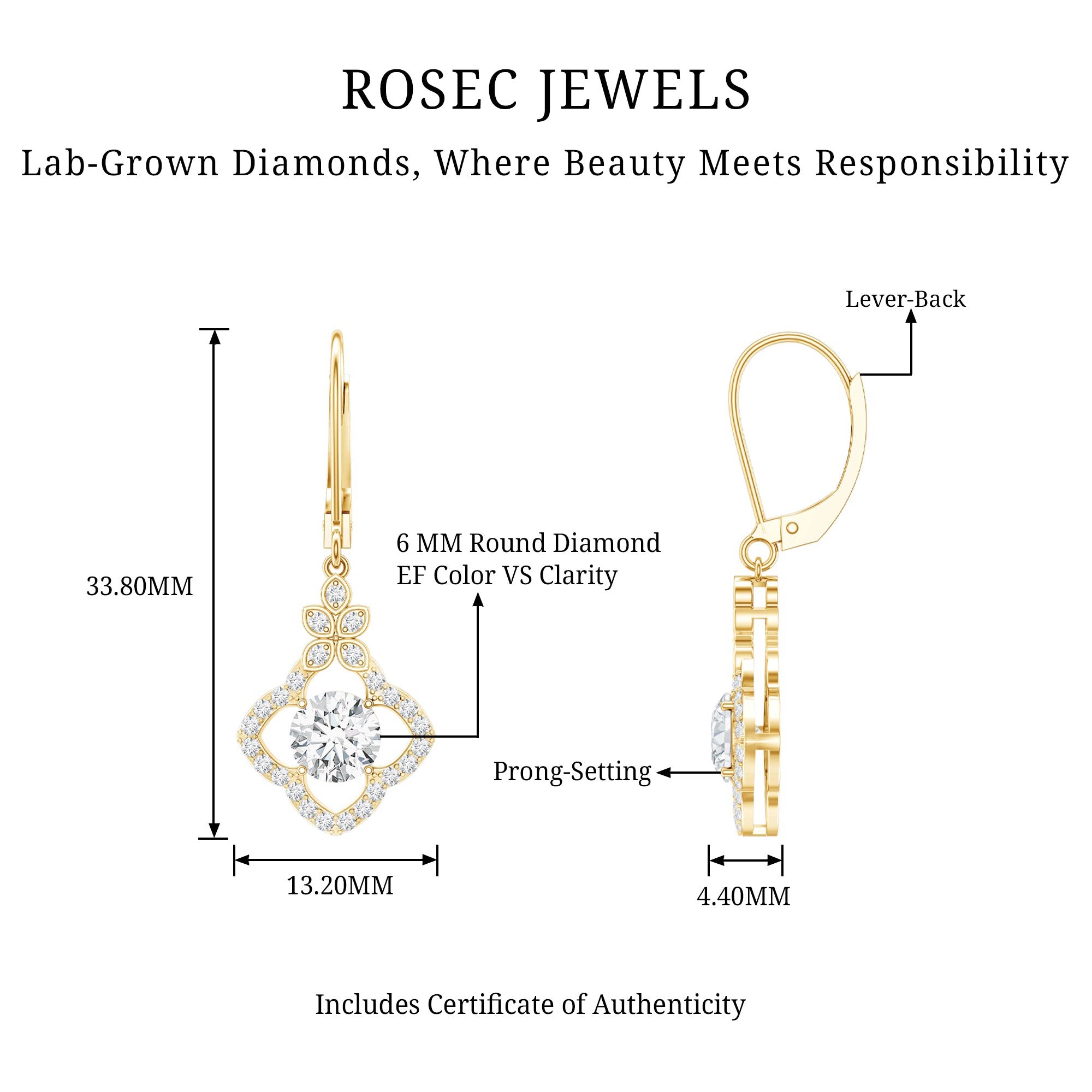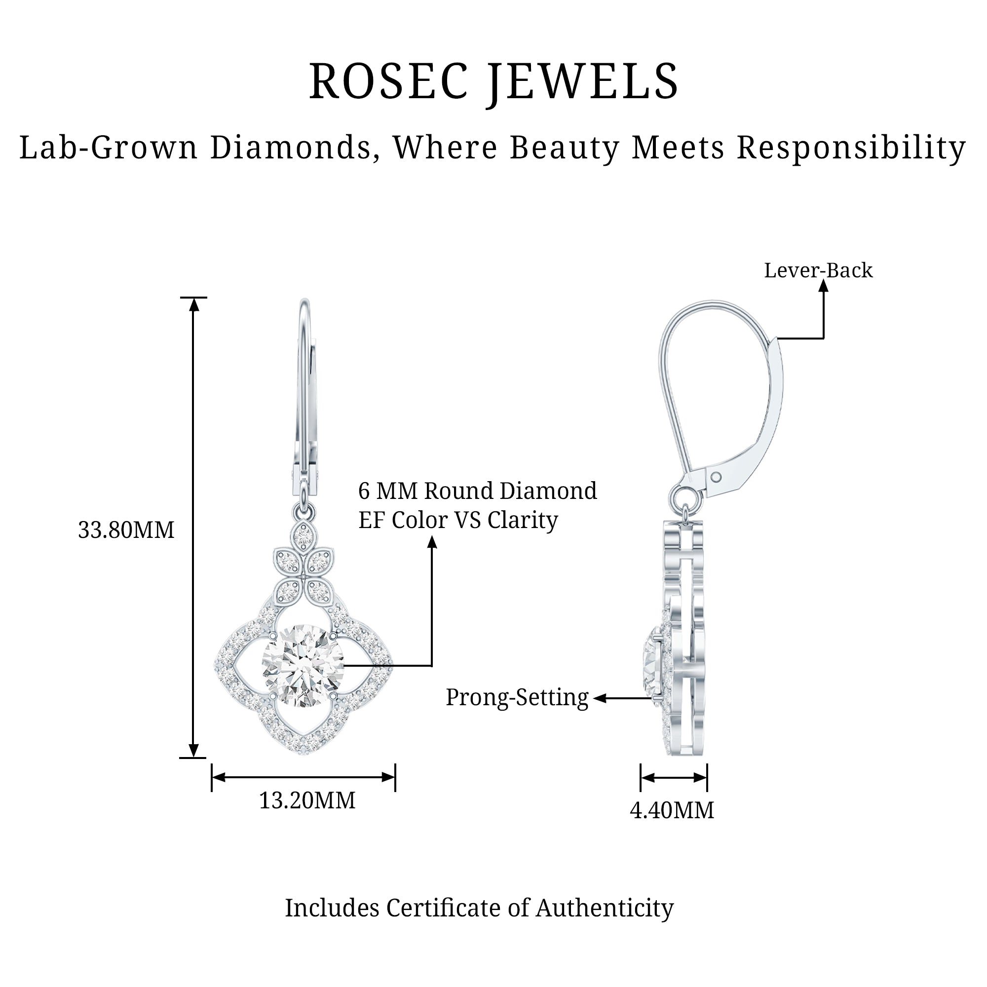Make her eyes sparkle as brightly as these Diamond Flower Earrings. We designed these Floral Drop Earrings to capture timeless elegance and charm, featuring a 6 MM round cut diamond (lab grown) in the center, set in prong setting. The center stone is surrounded by a floral-inspired diamond halo and a unique cluster of petals is placed at the top, crafted with fine attention to detail, giving these Drop Diamond Earrings a graceful and feminine touch. These Dangling Earrings are curated with lever back closure, ensuring both comfort and security, ideal for all-day wear. To guarantee premium craftsmanship, these affordable April Birthstone Earrings come with a certificate of authenticity.