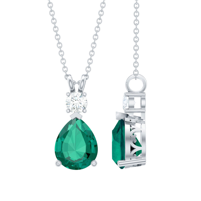 Effortlessly elegant, the Lab Gown Emerald Pendant Necklace complements both office attire and evening dates. It features an 8X10 MM Pear Shape Lab Created Emerald, securely held in Prong Setting and topped with a 4 MM shimmering Moissanite. This Pear Shaped Necklace exudes the classic shine of AAAA Quality Lab Cultured Emerald and D-VS1 quality moissanite, making it a perfect dazzler for any occasion. This Teardrop Pendant Necklace is classic jewelry that can be a perfect gift for your beloved on their special day. Crafted with both simplicity and significance, this item combines classic beauty with a contemporary flair, making it something you will want to revisit again and again. Whether you wear it with a formal ensemble or something more laid-back, it adds a touch of elegance to any outfit. Housed in a beautiful jewelry box, the Emerald and Moissanite Necklace turns into a cherished keepsake - ideal for treating yourself or delighting a loved one with a truly unforgettable gift. Plus, it includes a certificate of authenticity for the gemstone, ensuring you know you are receiving something genuinely special.