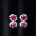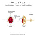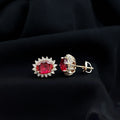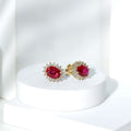Make your Anniversary a memorable occasion for her by giving her a heartwarming present like these Statement Earrings. These Stud Earrings are embellished with Oval Cut Created Ruby Set in Prong Setting with Diamond Halo, crafted in Solid Gold.