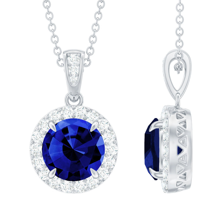 With its captivating fire and brilliance, this Lab Created Blue Sapphire Pendant stands as a stunning piece of jewelry for someone special to you. This Halo Necklace showcases an 8 mm Round Shape Lab Created Blue Sapphire set in a Claw Setting, enhanced by a Halo of White Diamonds. It embodies a vintage allure fused with contemporary elegance, ensuring it maintains its brilliance and consistently looks exquisite. Achieving a harmonious blend of beauty and versatile styling, this Halo Pendant provides a dazzling appearance while subtly enhancing the overall aesthetic. The AAAA quality lab created blue sapphire is expertly crafted, revealing unique traits that set it apart. It is designed to be treasured and loved forever, much like the memories of those significant moments in your life. Both meaningful and beautiful, this Created Sapphire Necklace displays a unique sparkle along with ethical benefits. It is an outstanding choice for a woman seeking a remarkable piece of jewelry that will last through the years. As a symbol of elegance, it reflects your style and personality while striking a balance between classic radiance and sophistication. This Lab Grown Sapphire Necklace makes an ideal gift for anniversaries, birthdays, or weddings.