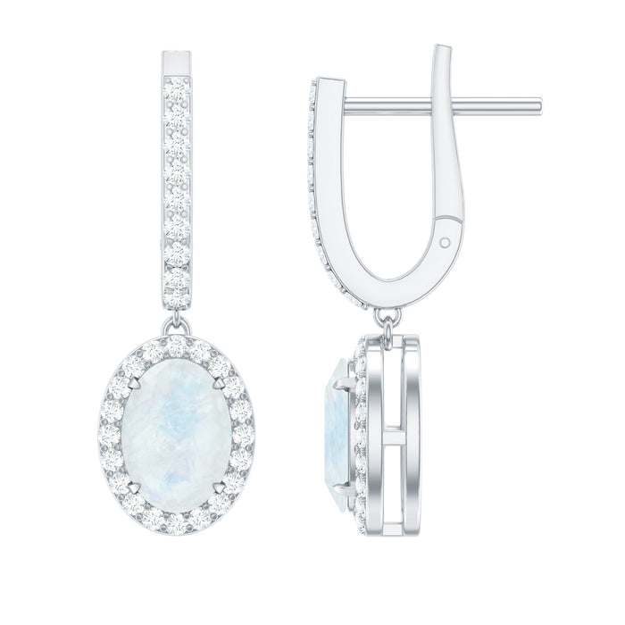 Celebrate this mothers day with stunning and beautiful Drop Hoop Earrings for your loving mother. These Earrings adorned with Oval Cut Moonstone in Claw Setting with Diamond Halo, crafted in Solid Gold Metal.