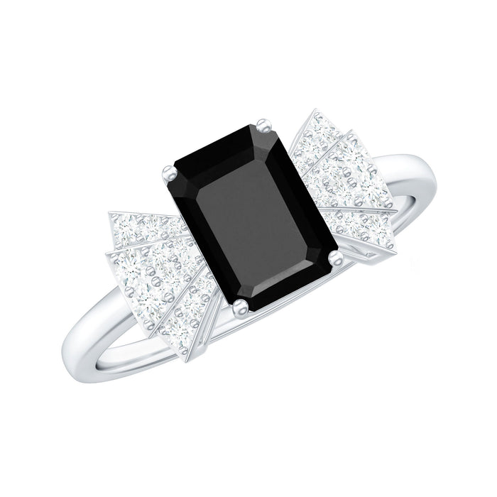 Make a bold statement with this one-of-a-kind Octagon Cut Created Black Diamond Engagement Ring. Its unique shape is sure to turn heads and adds an artistic touch to your look. The ring features a 6X8 MM octagon cut Created Black Diamond in a prong setting, surrounded by round Diamond stones for added sparkle.