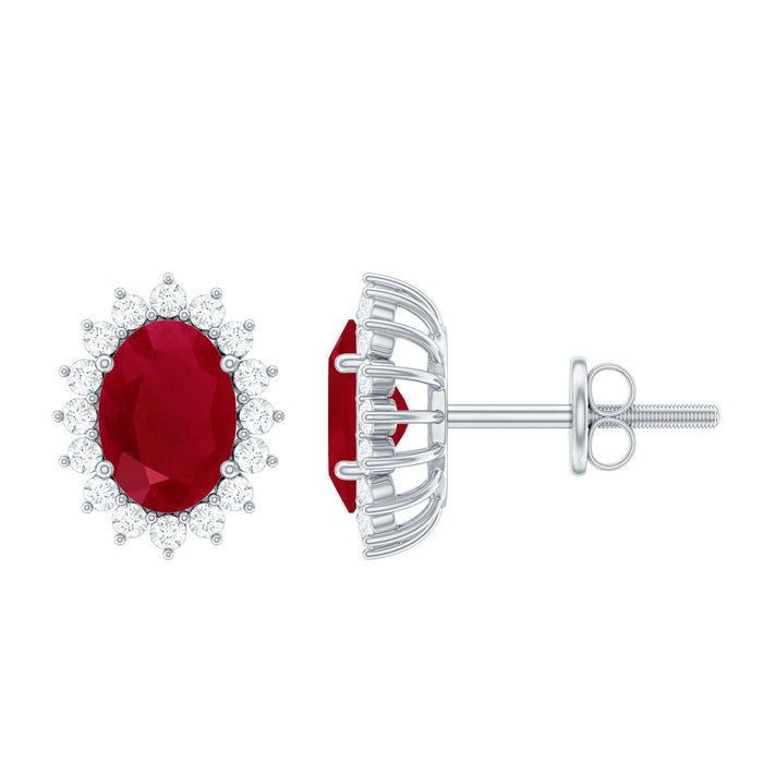 These Classic Starburst Stud Earrings are embellished with Oval Cut Ruby and are set as Solitaire in a Prong Setting encircled with small Round Shape Diamond stones, crafted in a Solid Gold Metal.