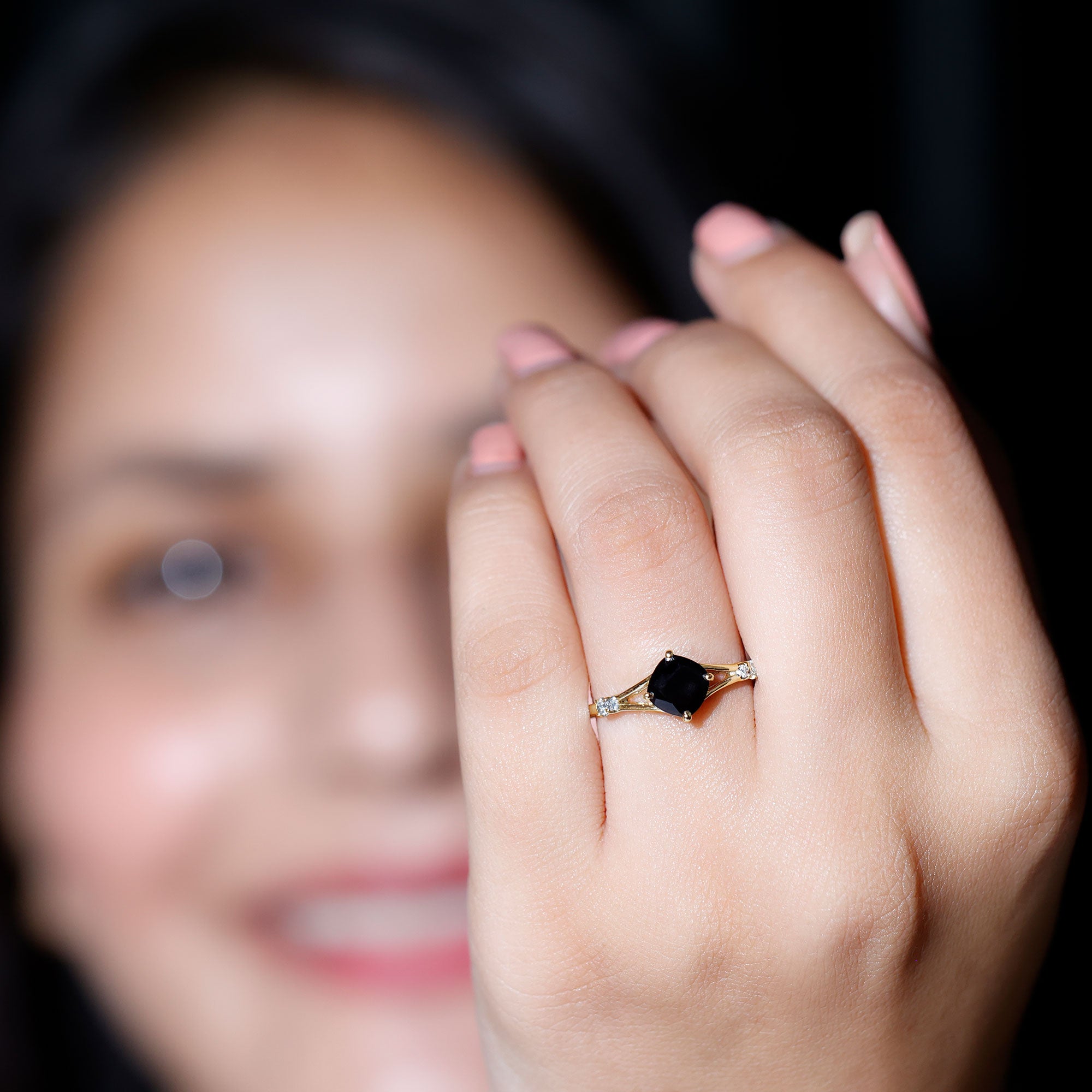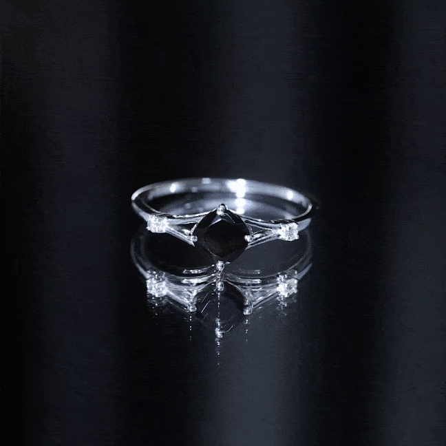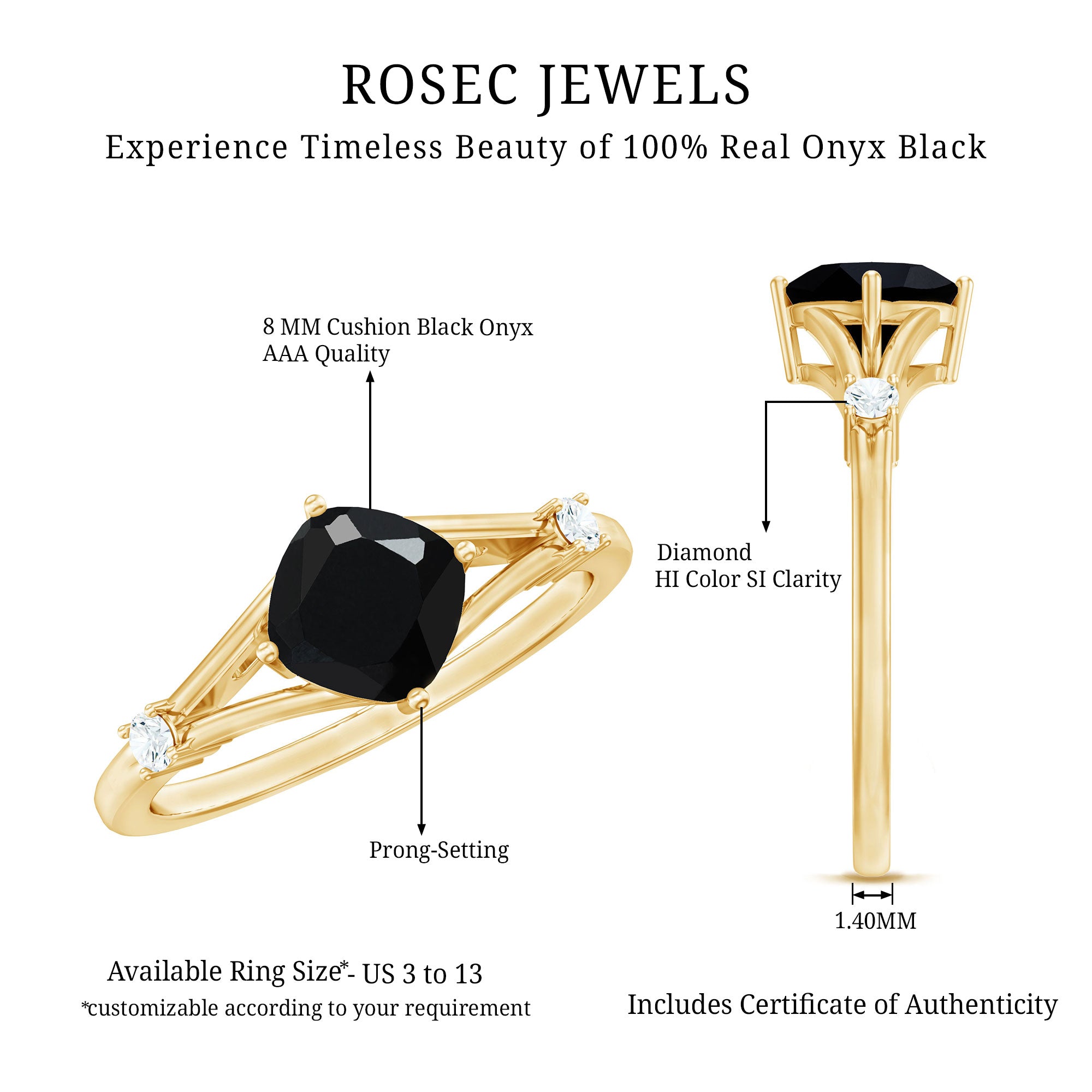 Enhance your love with this Split Shank Engagement Ring to give her a birthday gift. This Engagement Ring has decorated with a Diagonal Cushion Cut Black Onyx as a solitaire in a 4-prong setting with Round Diamond in a prong setting. This Cushion Solitaire Engagement Ring is highly customizable with an array of metal options to choose from, which further allows you to add some personal touches to them.