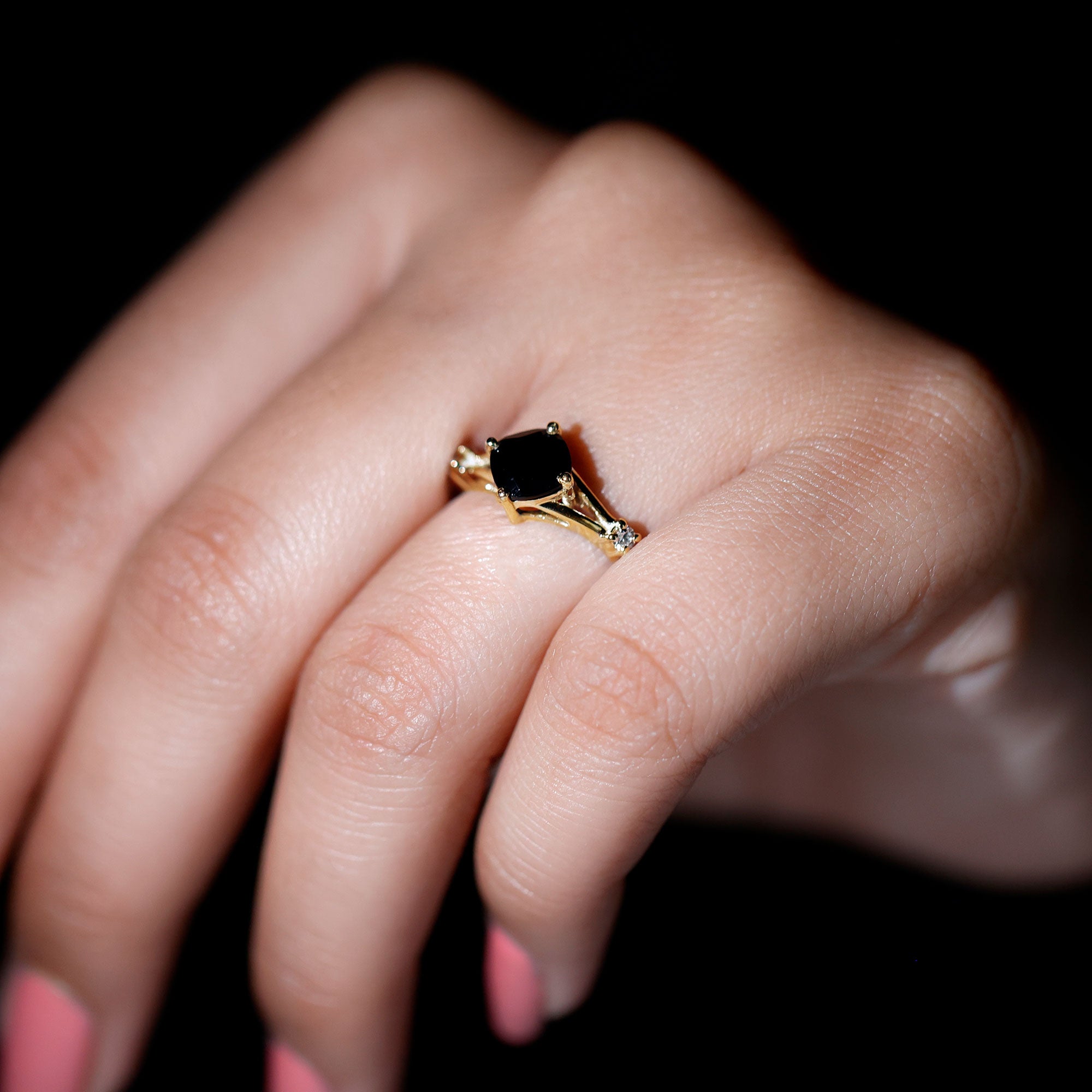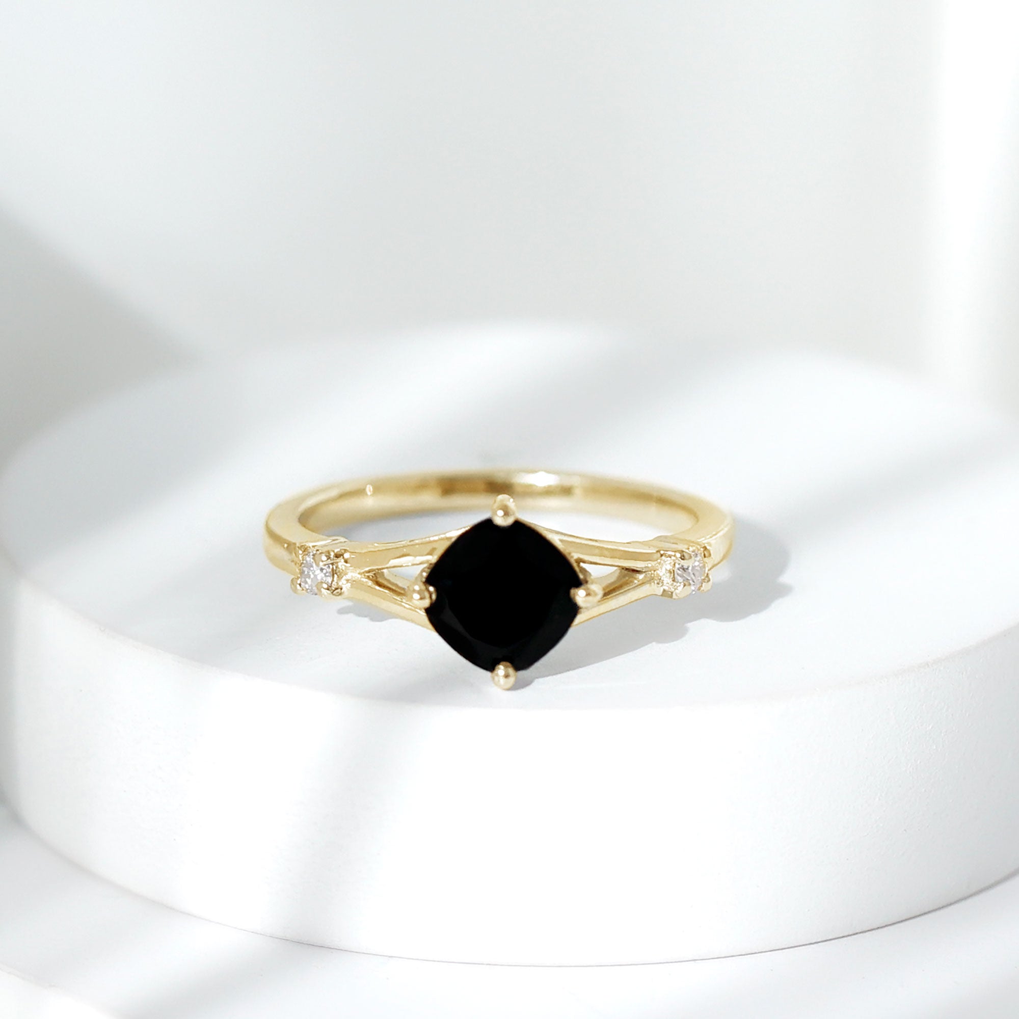 Cushion Black Onyx Split Shank Engagement Ring with Diamond