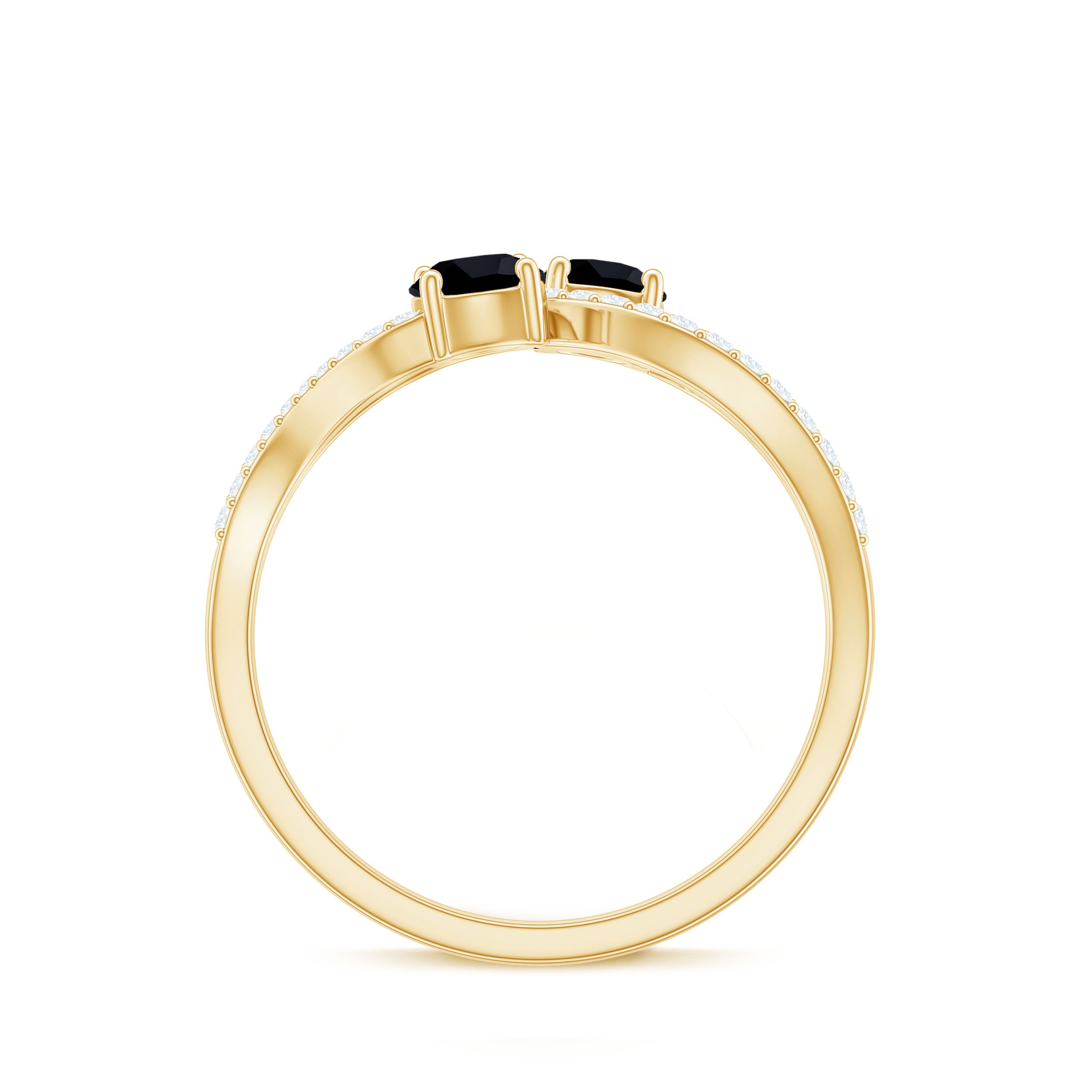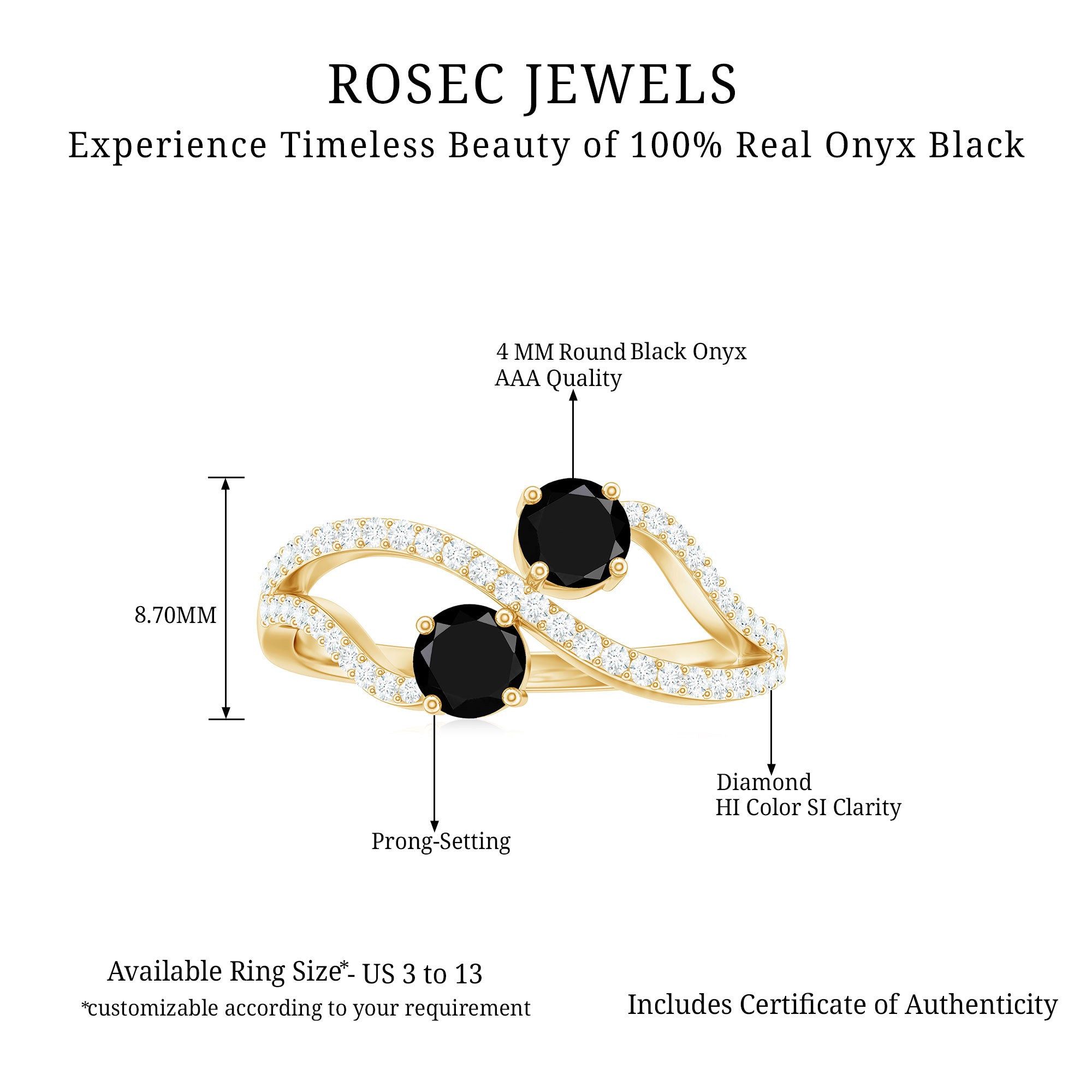 When two hearts illuminate each other, the outcome is a ring that is as significant as it is exquisite. This Toi et Moi Engagement Ring narrates a love story through its distinctive two-stone design. It showcases a 4MM two round shape black onyx, elegantly set in prong settings to highlight their remarkable brilliance. Together, they symbolize two individuals with unique journeys and characteristics uniting in perfect harmony. Enhancing its allure, the band gracefully flows in a bypass style, adorned with small round diamonds stones that provide just the right touch of additional sparkle. The design of the band not only contributes elegance but also subtly directs the gaze towards the stunning center stones. Meticulously crafted for both comfort and aesthetics, this Bypass Engagement Ring is perfect for daily wear as well as special events. It embodies a message of love, balance, and unity, making it a considerate choice for a proposal, a significant gift, or a romantic gesture. With its dazzling stones and meaningful design, this Black Onyx Engagement Ring combines contemporary beauty with emotional significance in one breathtaking piece. It arrives in a beautiful jewelry box, prepared to commemorate a special moment in your love story. A representation of you and me, this Designer Engagement Ring serves as a lasting reminder of love.