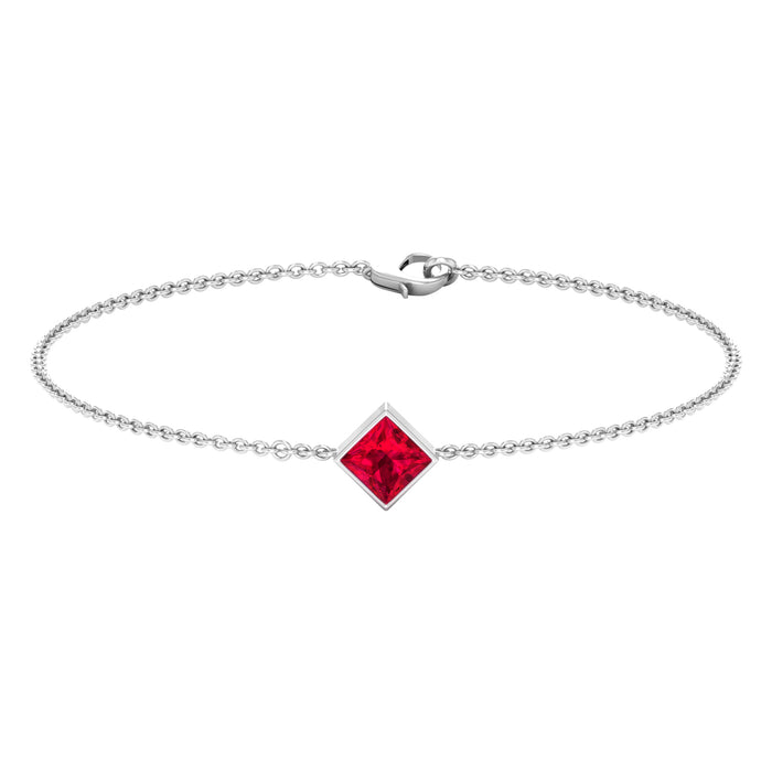 Make a stunning impression on your lady with this Minimal Solitaire Bracelet, adorned with a beautiful Princess Cut Ruby set in a durable Bezel Setting. The Solid Gold Chain Bracelet adds a touch of elegance to the overall design, making it a truly eye-catching and appealing piece of jewelry. Perfect for those born in July, this Ruby Chain Bracelet is an ideal birthday gift that is sure to be treasured for years to come. With its sophisticated design and brilliant sparkle, its the perfect addition to any jewelry collection.