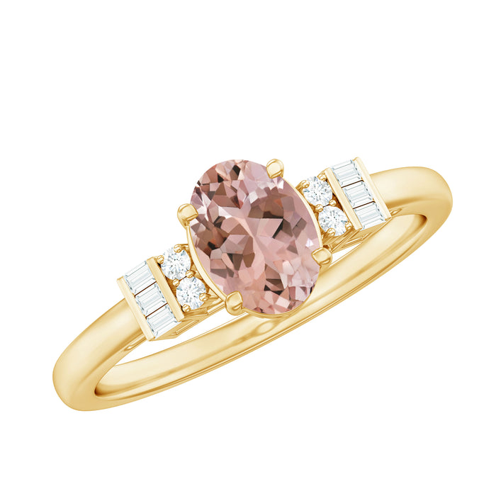 Product Details Adorned with an Oval Cut Morganite Solitaire, this Engagement Ring makes for an elegant choice to mark the big day of your life. Diamond Accent on the Solid Gold band give a charming appeal to this Solitaire Engagement Ring.