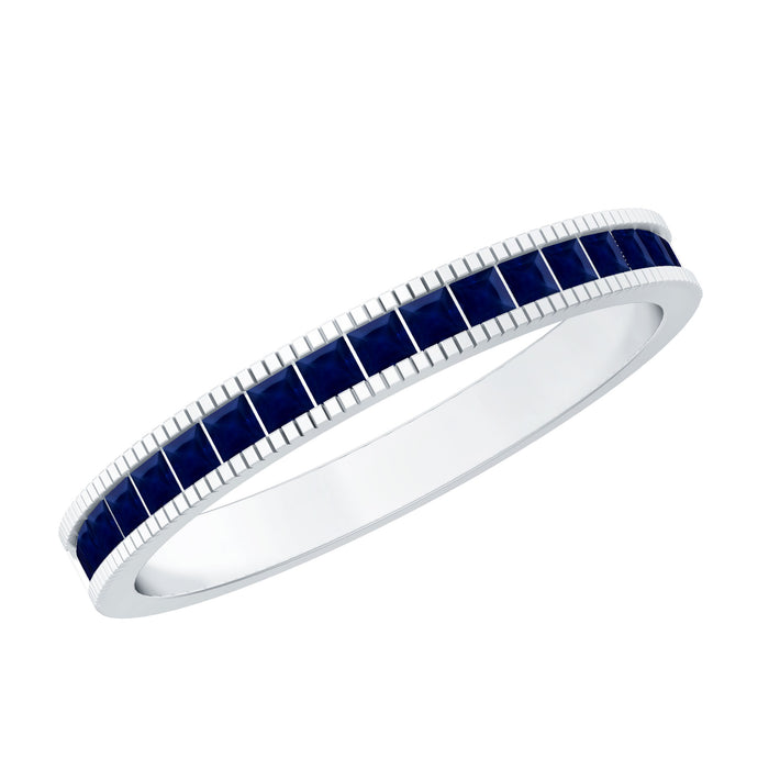This Half Eternity Ring is a glamorous piece embellished with precious Princess Cut Blue Sapphire Gemstones in Milgrain Channel Setting, Crafted in gold for an opulent appeal.