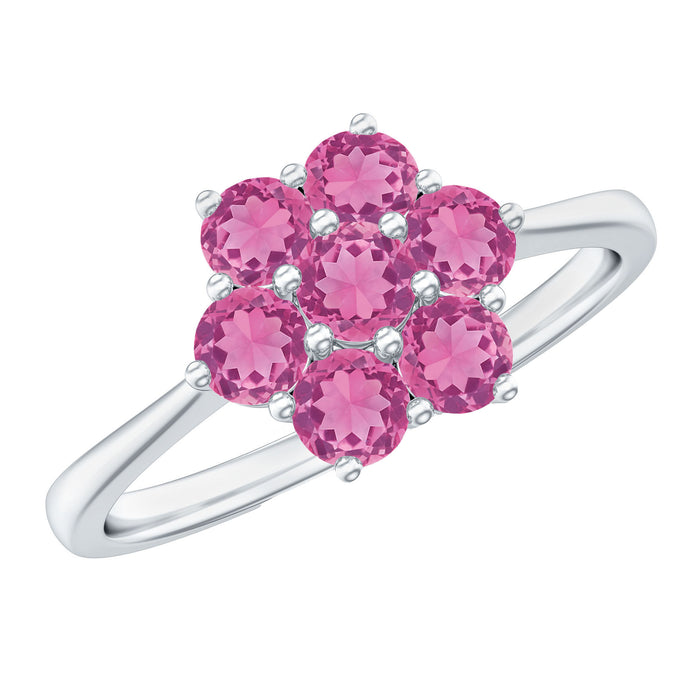 The Classic Flower Ring features a simple yet elegant design with a round pink tourmaline set in a cluster prong setting. This stunning floral arrangement amplifies the rings beauty, which is crafted with Solid Gold.
