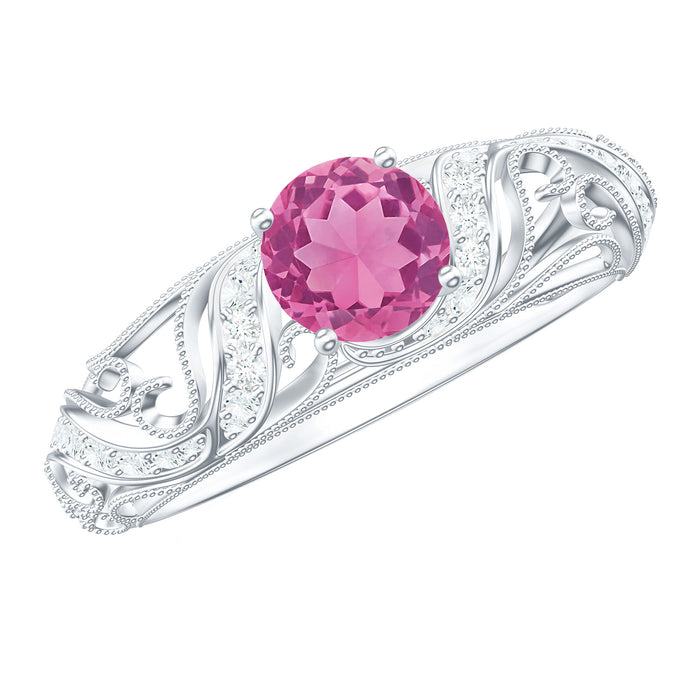 The brightness of Pink Tourmaline makes this vintage engagement ring more appealing. The Pink Tourmaline Ring is embellished with Round Diamond, glistening on the shank beautifully. The Pink Tourmaline Diamond Engagement Ring is accentuated with Beaded Gold, make your significant feel more precious with this Pink Tourmaline Gold Ring.