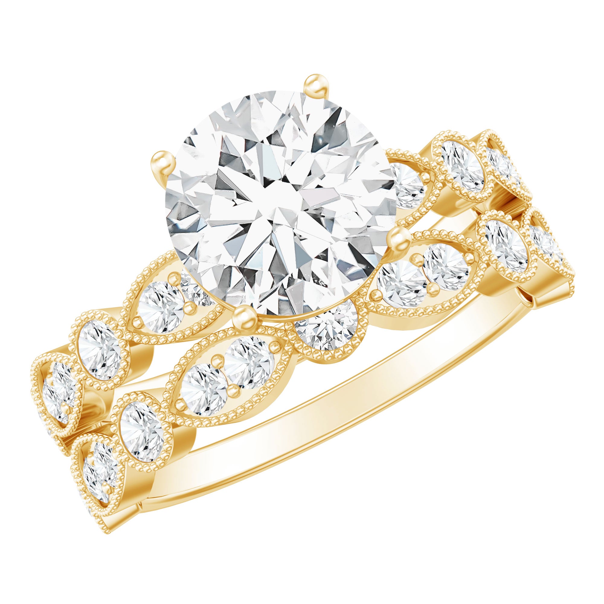 This Moissanite Wedding Ring Set blends timeless beauty with a modern twist, making it an ideal choice for brides who love classic style with a fresh, contemporary edge. The 2 Piece Bridal Set features a beautifully crafted Designer Engagement Ring and matching Wedding Band. At its center, the engagement ring showcases an eye-catching 8 MM round cut Moissanite, securely set in basket setting. Sparkling side stones and delicate beaded details adorn the scalloped shank, adding depth and elegance to the design. The coordinating wedding band mirrors the scalloped style, with more shimmering moissanite accents and intricate beading that complement the engagement ring perfectly. Together, they create a harmonious, textured look that enhances the brilliance of the center stone. Crafted with care by skilled artisans, this Engagement Ring and Wedding Band Set is a stunning and affordable way to celebrate your love. The high-profile setting brings sophistication without compromising comfort, making it suitable for everyday wear or special occasions. Whether for your big day or as a heartfelt gift, this Moissanite Bridal Ring Set is designed to be treasured for a lifetime.