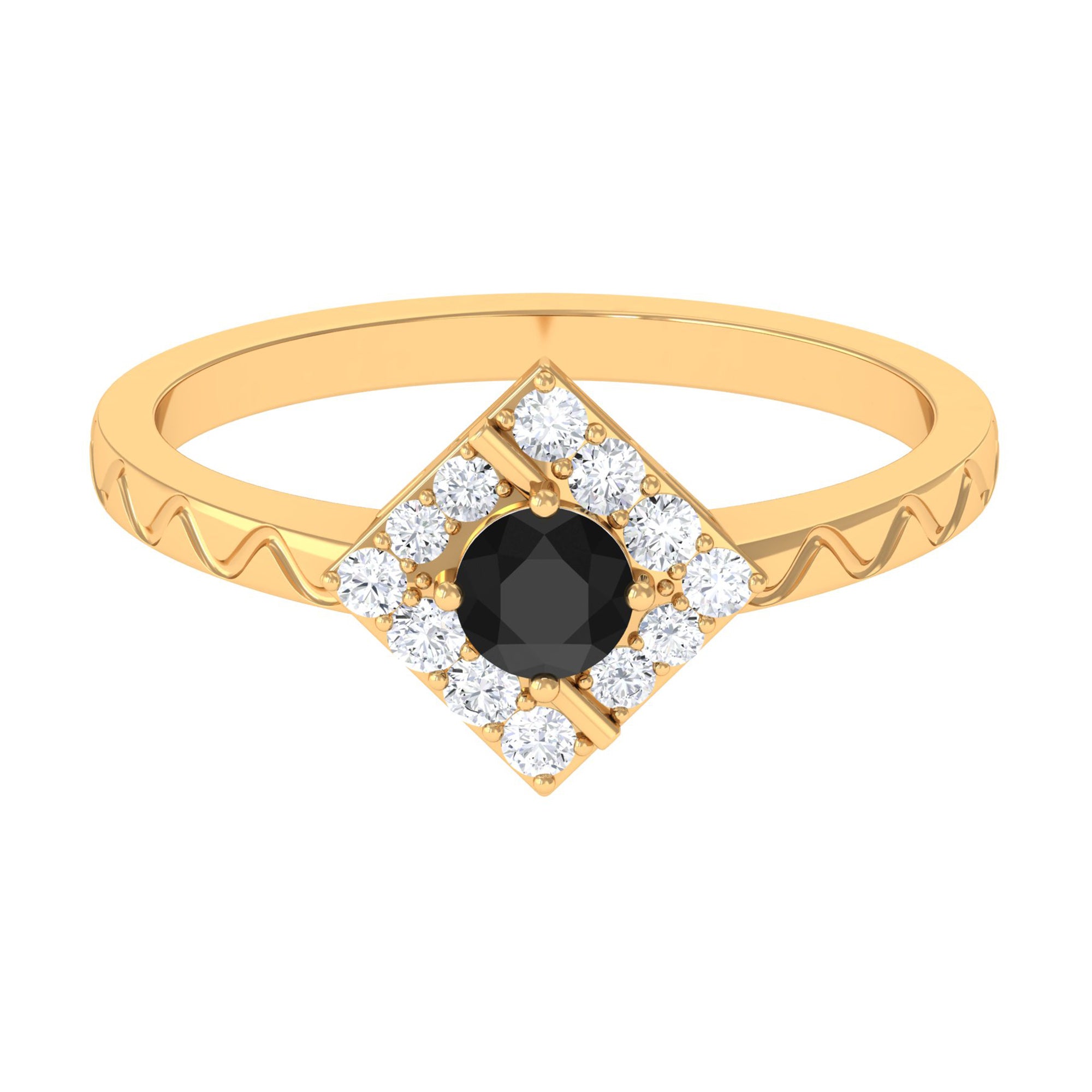 Feel uplifted everyday with this Classic Black Spinel Ring. This beautiful Minimal Ring is adorned with Round Shape Black Spinel set in the Center in 4 Prong Setting with Round Shape Diamond Accent on textured gold shank. Its classic and sparkling appearance makes it a first choice among working and young women.