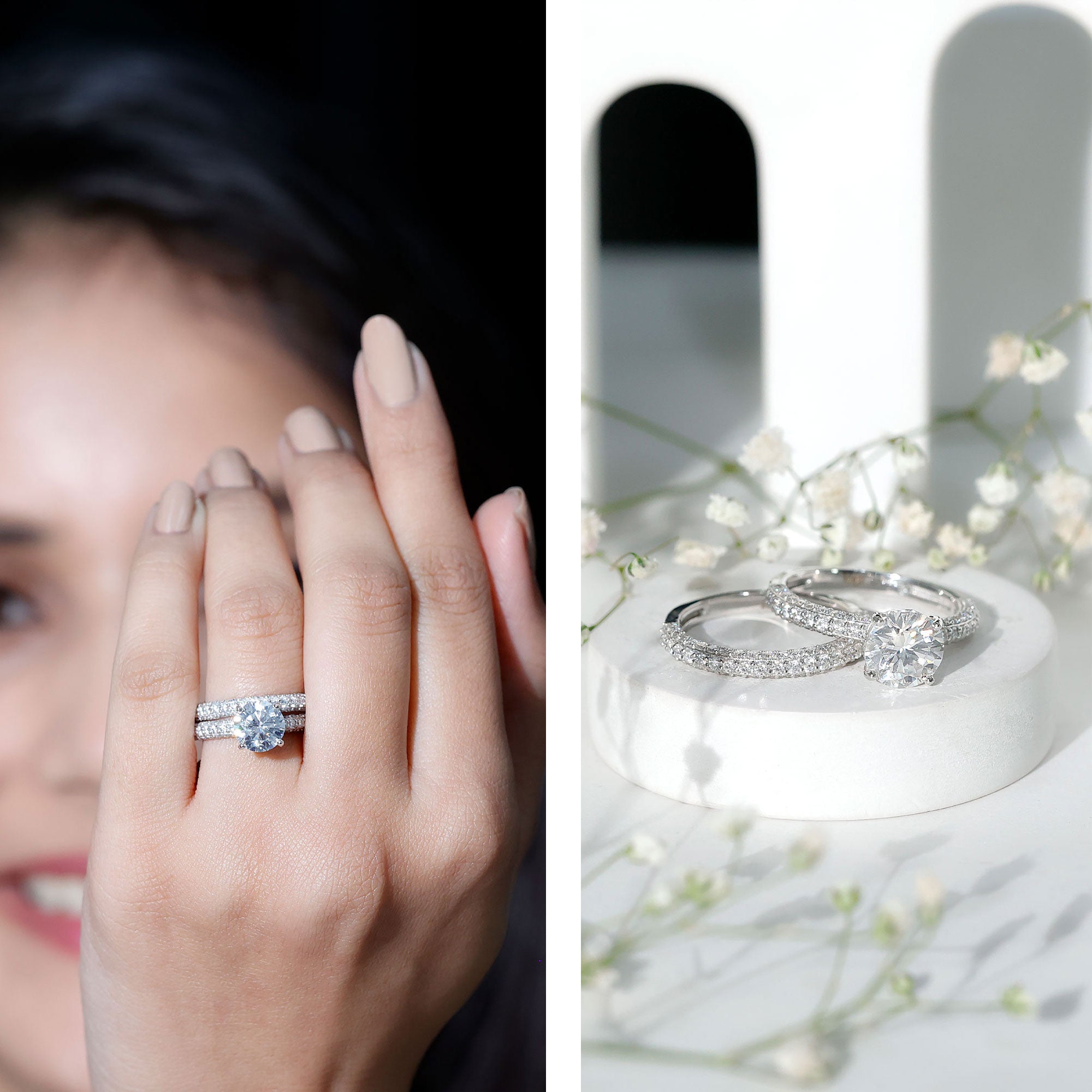 The Classic Moissanite Ring Set is perfect for making the big day special. This Ring Set features a Solitaire Ring with an enhancer band. The Engagement ring features an 8 MM Moissanite whereas the enhancer is partially embedded with petite diamonds. This Wedding Ring Set beholds the shine of D-VS1 Quality Moissanite which makes it perfect for the special day. This ring set can be styled separately as an Engagement Ring or a Band Ring. This Bridal Ring Set reflects royalty and elegance and makes your bride feel special. Our Ring Set will come in a Signature Box for storage whenever you are not wearing it.