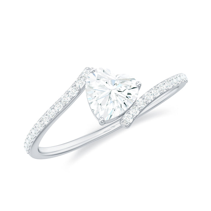 Embrace sophistication with a Moissanite Engagement Ring crafted to radiate beauty and significance. At its heart lies a breathtaking 5MM heart shaped moissanite, securely held in a prong setting. The bypass band elegantly encircles the center stone, creating a flowing, romantic silhouette that symbolizes the union of two paths into one. Small round moissanites twinkle along the band, adding a subtle shimmer that enhances the radiance of the central stone. This seamless twist imparts a contemporary, flowing appearance to the Bypass Engagement Ring while symbolizing unity, balance, and the shared journey of two individuals uniting. With D color and VS1 clarity, the moissanite emits pure light, making this Heart Engagement Ring an exquisite choice for proposals, weddings, anniversaries, or any significant occasion. The bypass design not only offers a contemporary twist on the classic solitaire but also enhances comfort, making it suitable for daily wear. Its lightweight yet eye-catching design is ideal for someone who values understated luxury with a touch of individuality. This Solitaire Engagement Ring comes beautifully presented in a keepsake jewelry box, ready to be gifted or treasured for oneself. It transcends being merely a Solitaire Moissanite Ring; it embodies your narrative, enveloped in sparkle.