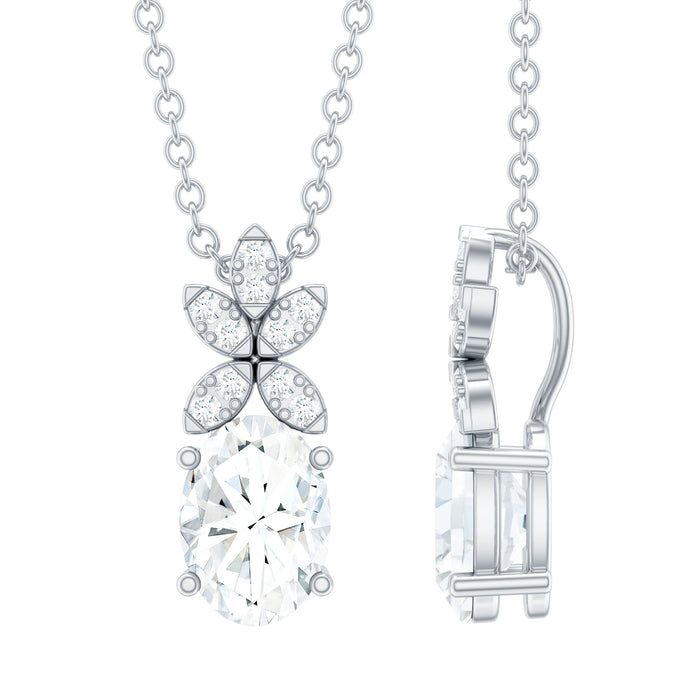 Add some dazzling luxe and natures touch to your attire with this lab grown Diamond Pendant Necklace. It features a 5X7 MM Oval Shape Lab Grown Diamond of EF-VS quality set securely in Prong Setting with a floral design at the top embedded with round shape small gemstones. The hidden bail seamlessly connects the Solitaire Pendant, allowing the necklace to sit gracefully on the neckline without any distraction. Whether you are celebrating an anniversary, a milestone, or simply expressing your love, this Floral Necklace makes a perfect present for any woman.