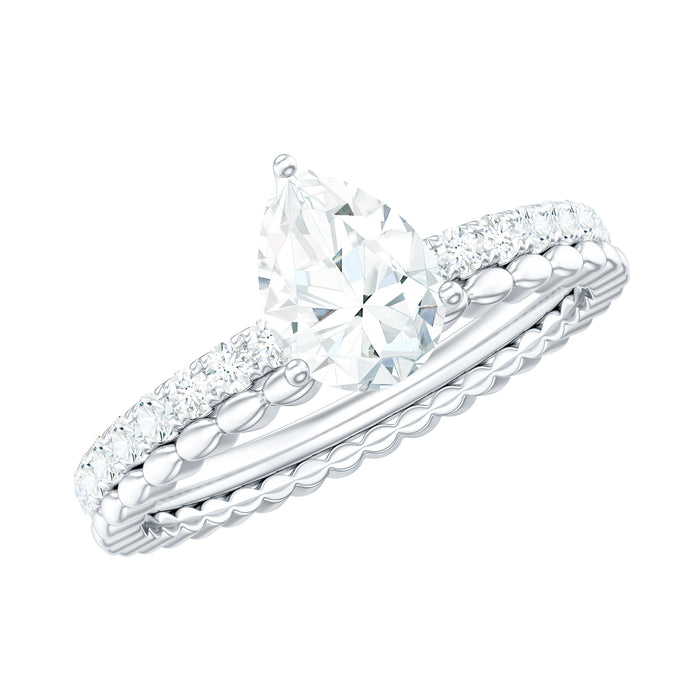Every day is a chance to begin again, much like this ring is a beginning to your story. Win her heart with the stunning details of this Solitaire Engagement Ring, featuring a 5X7 MM Pear Cut Moissanite (D-VS1 quality) securely set in prongs. The unique shank brings an artistic touch, with one band embellished with a row of surface prong set round cut moissanites for a constant sparkle, adjoining it a delicate marquise shaped metal motifs and gemstones set alternately for a contemporary vibe. Together, these elements in this Moissanite Engagement Ring create the look of a wide band while ensuring the comfort and secureness in a single band. Designed to symbolize everlasting love, this Moissanite Ring is perfect for the bride who values elegance, uniqueness, and timeless beauty. Made with precision and style, the Engagement Ring is offered in various metal types and colors, providing a luxurious and sustainable symbol of your connection.