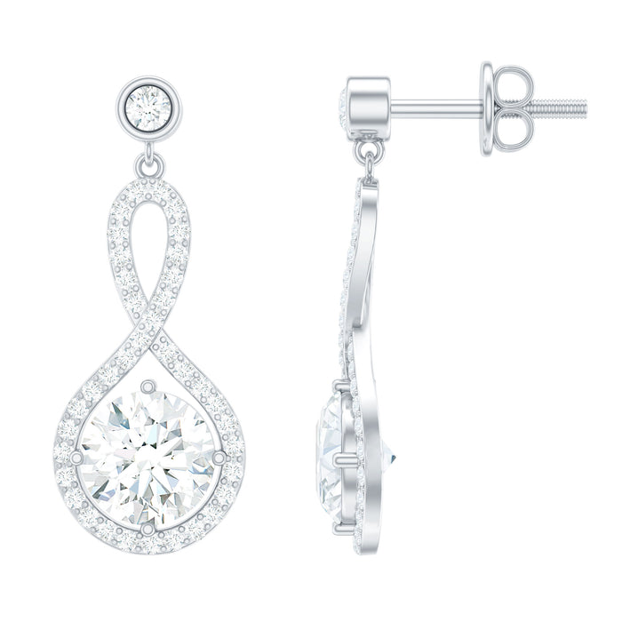 Wow her with a pair of fashion-forward Dangling Drop Earrings. These exquisite Diamond Infinity Earrings beautifully symbolize forever beauty and endless love. Fashioned in top notch metal, each dazzling earring features a 6 MM round cut prong set diamond (lab grown) surrounded with an infinity frame of smaller white accent diamonds. Designed for both comfort and security, a small bezel set stone connects with screw back closure ensuring a snug and effortless fit. These Diamond Bridal Earrings are ideal for your D-day or any special occasion. You can present these Infinity Drop Earrings as a meaningful gift or a personal statement of eternal grace, they are a timeless treasure to cherish lifetime.