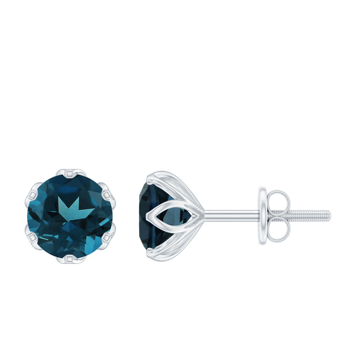 Grace yourself with this beautiful pair of Solitaire Stud Earrings embellished with sparkling London Blue Topaz Solitaire set in Lotus Basket Setting and appears as flower. Solid Gold composed London Blue Topaz Earrings will steal the spotlight for you in the parties and celebrations.