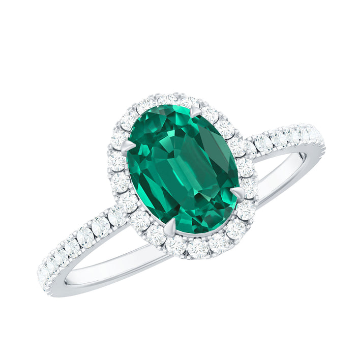 Make her feel truly cherished with this breathtaking Halo Engagement Ring, designed to shine on her special day and every day after. With a simple yet elegant design, this Oval Engagement Ring puts the spotlight on the center gemstone in the most beautiful way. At the heart of the ring is a stunning 6x8 MM oval cut lab created emerald, sparkling with brilliant fire and clarity. Surrounding it is a delicate floating halo of round diamond stones that enhance the center gem’s glow and add extra brilliance. The band features more dazzling round shaped diamonds, creating a striking, radiant look that catches the eye from every angle. This 1.75 Carat Engagement Ring blends classic charm with a touch of modern elegance. Crafted with precision and care, this Halo Ring is available in a range of sizes to ensure the perfect fit. Every detail of this Lab Created Emerald Ring reflects love, craftsmanship, and commitment. Let it tell your love story with brilliance and grace, because she deserves nothing less than extraordinary.