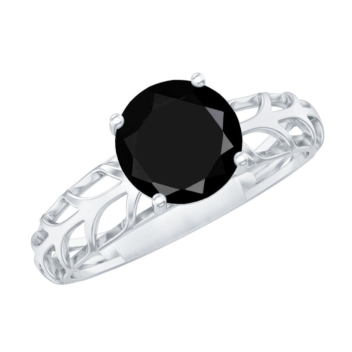 Embrace sophistication with this stunning Black Solitaire Ring. A 7 MM Round Shape Created Black Diamond set as a center stone in Prong Setting that exudes timeless beauty. The cutout pattern on shank of this ring symbolizes both modernisms and vintageness.