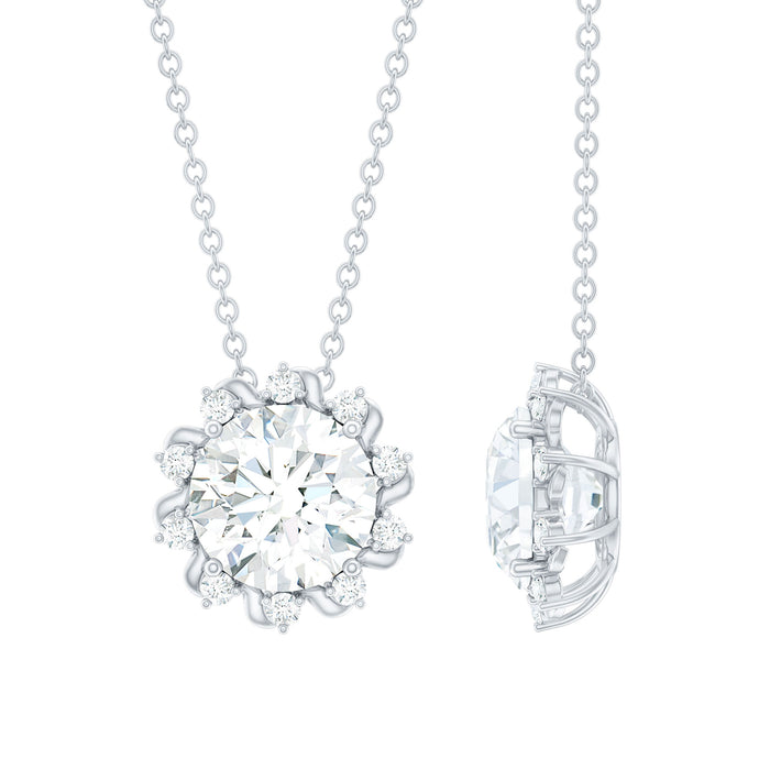 This mesmerizing 2 CT Diamond Necklace is a fine piece of jewelry with a soft and subtle appeal. It features a brilliant 8 MM round-shaped diamond (lab grown) stone of EF-VS quality. The gem is securely nestled in a prong setting, ensuring a sleek and polished look. The sunburst design with smaller diamonds surrounds the main stone and adds a unique, nature-inspired charm that makes this Round Diamond Pendant both timeless and striking. This Sunburst Pendant is a thoughtful and meaningful gift for anyone born in April or for those who appreciate the beauty of nature. Our beautiful pieces of jewelry are delivered to you in a premium jewelry box and handed over to you in a ready-to-gift state.