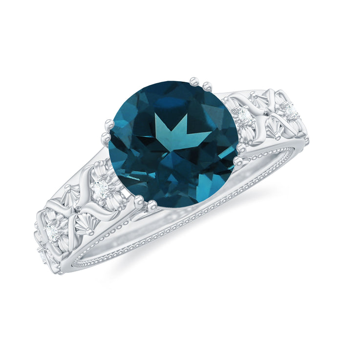 This London Blue Topaz Engagement Ring is an exceptionally unique piece, crafted to enchant with its nature-inspired elegance and brilliant shine. At its core lies an 8 MM round cut London Blue Topaz, securely set in a classic double prong setting as a timeless solitaire. Surrounding this centerpiece are intricate floral engravings along the band, embellished with small Diamond stones that contribute an elegant shimmer and a hint of vintage allure. The Solitaire Engagement Ring showcases exquisite beaded detailing that enhances its graceful aesthetic, while a hidden flower motif beneath the central stone reveals a sparkling peek-a-boo stone - introducing a delightful touch of brilliance without overshadowing the stunning solitaire. Designed for those who appreciate nature and everlasting romance, this Vintage Style Ring harmoniously merges soft floral motifs with radiant sparkle. The AAA quality London Blue Topaz and HI-SI quality Diamonds reflects light beautifully, symbolizing love, commitment, and treasured memories. Ideal for brides seeking something distinctive yet timeless, this Nature Inspired Engagement Ring intertwines romance, sophistication, and a touch of old-world charm. It is a significant piece she will cherish eternally, a true homage to love in every intricate detail.