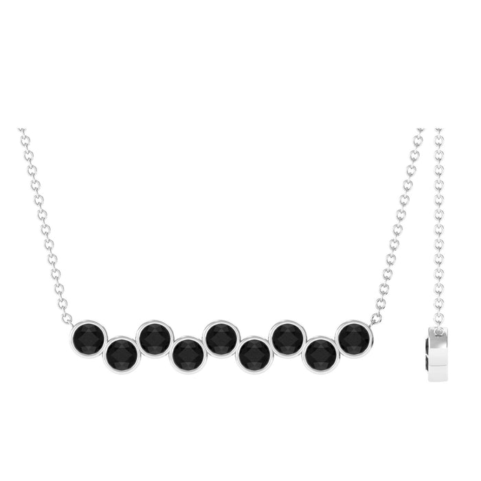 Make a statement at any party or special occasion with this elegant and chic Black Onyx Necklace. The necklace features nine round cut black onyx stones, each set securely in bezel setting. The stones are arranged in a beautiful horizontal bar design with a subtle zig zag pattern, giving it a modern and slightly edgy vibe. The bezel finish adds a sleek touch while also keeping each stone safe and protected for everyday wear. Crafted from high-quality hallmarked metal, this 9 stone necklace feels premium and durable while still being lightweight and comfortable. The bar design is attached to a matching cable chain, making it perfect for layering with other necklaces or wearing on its own as a statement piece. It sits gracefully on the neckline and adds just the right amount of contrast to any outfit. The deep black onyx gives this Bar Necklace a bold yet elegant look. The Black Stone Necklace comes beautifully packed in a jewelry box, making it ready for gifting. Ideal for birthdays, anniversaries, celebrations, or just as a thoughtful surprise, this piece is perfect for women who love modern elegance with a touch of edge.