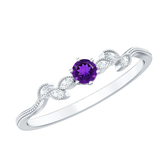 Make a charming statement with this beautiful Milgrain Leaf Ring. The ring is embellished with a Round Shape Amethyst and accented with sparkling Diamonds. A perfect piece for any woman, this Amethyst Promise Ring adds a touch of elegance and beauty to any look.