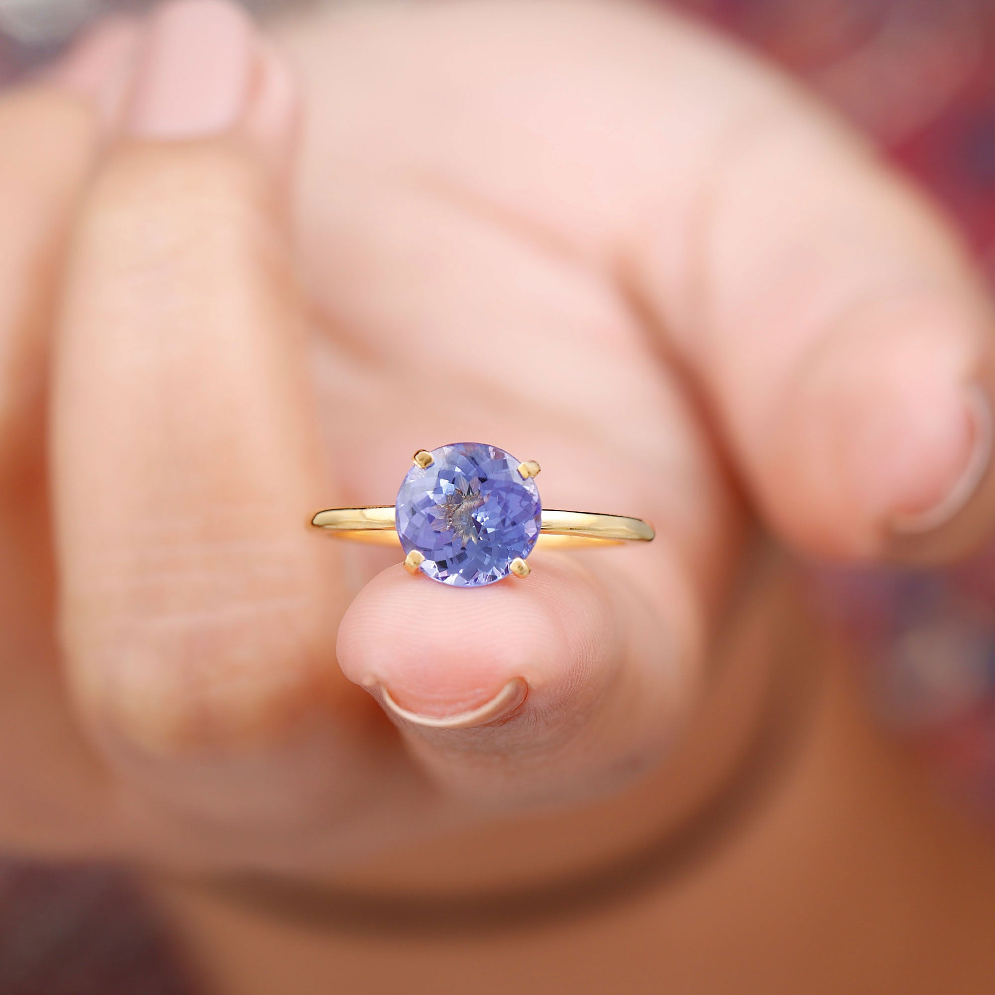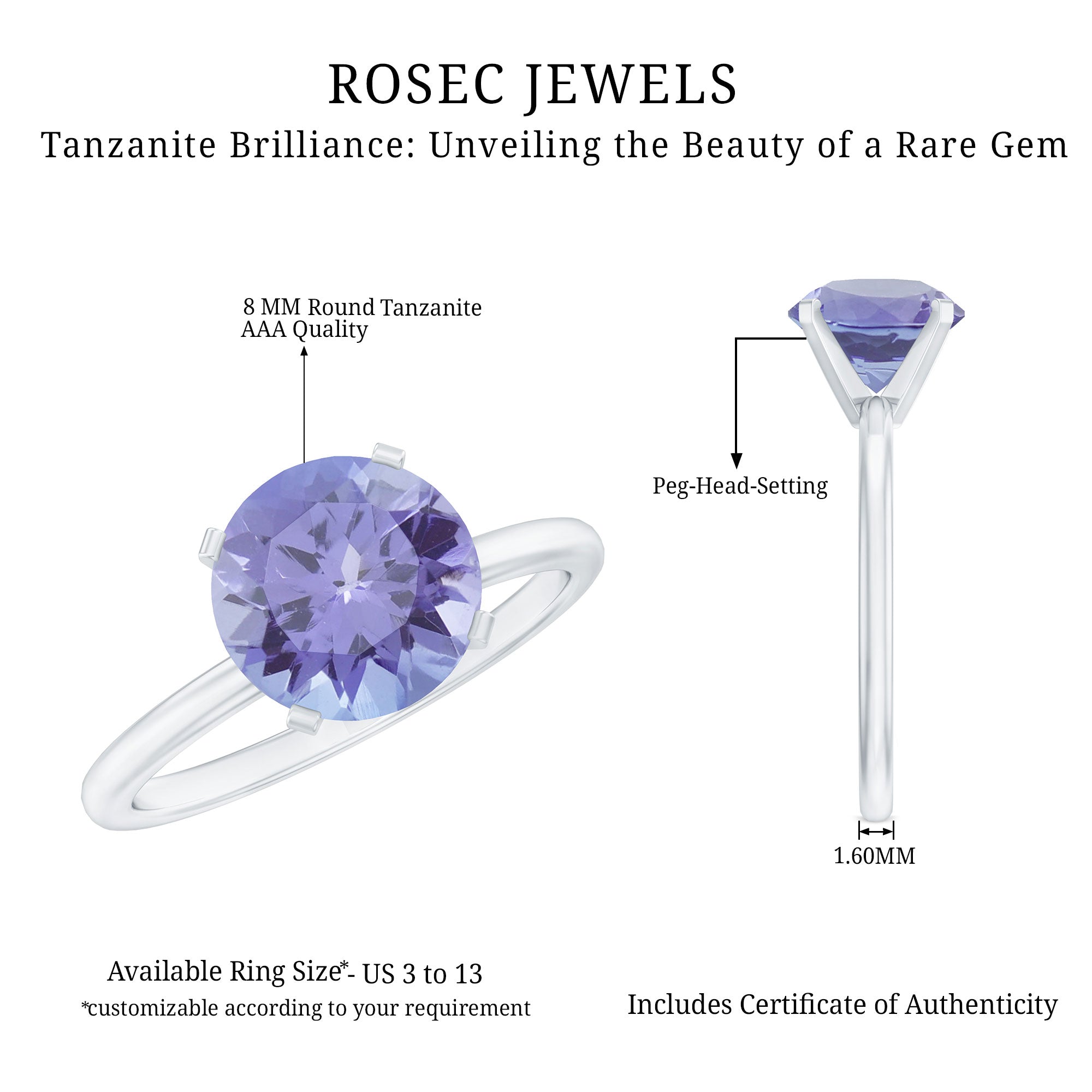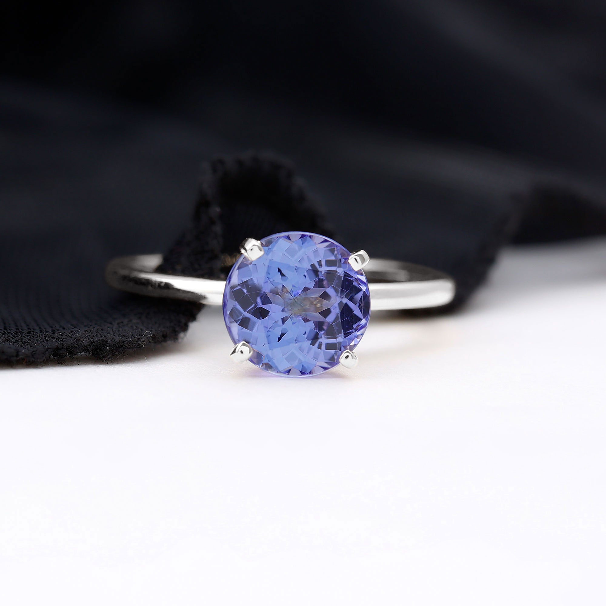 For a ring that exudes sultry elegance and is sure to become the center of attention among her besties, look no further than this mesmerizing Solitaire Ring. It features a captivating 8 mm round shape Lab Grown Tanzanite gemstone set as the striking solitaire in a sophisticated 4 Prong Peg Head Setting. This Tanzanite Engagement Ring is an absolute stunner, a perfect expression of your love, and a meaningful choice for your important day.
